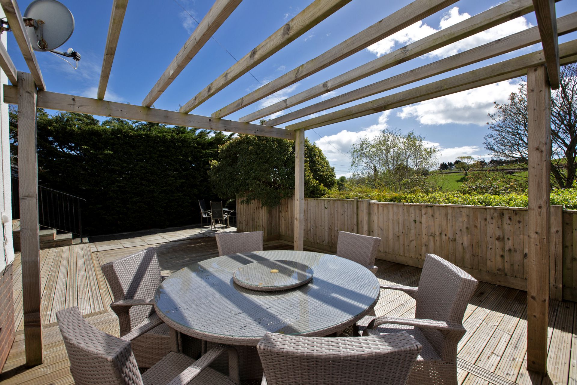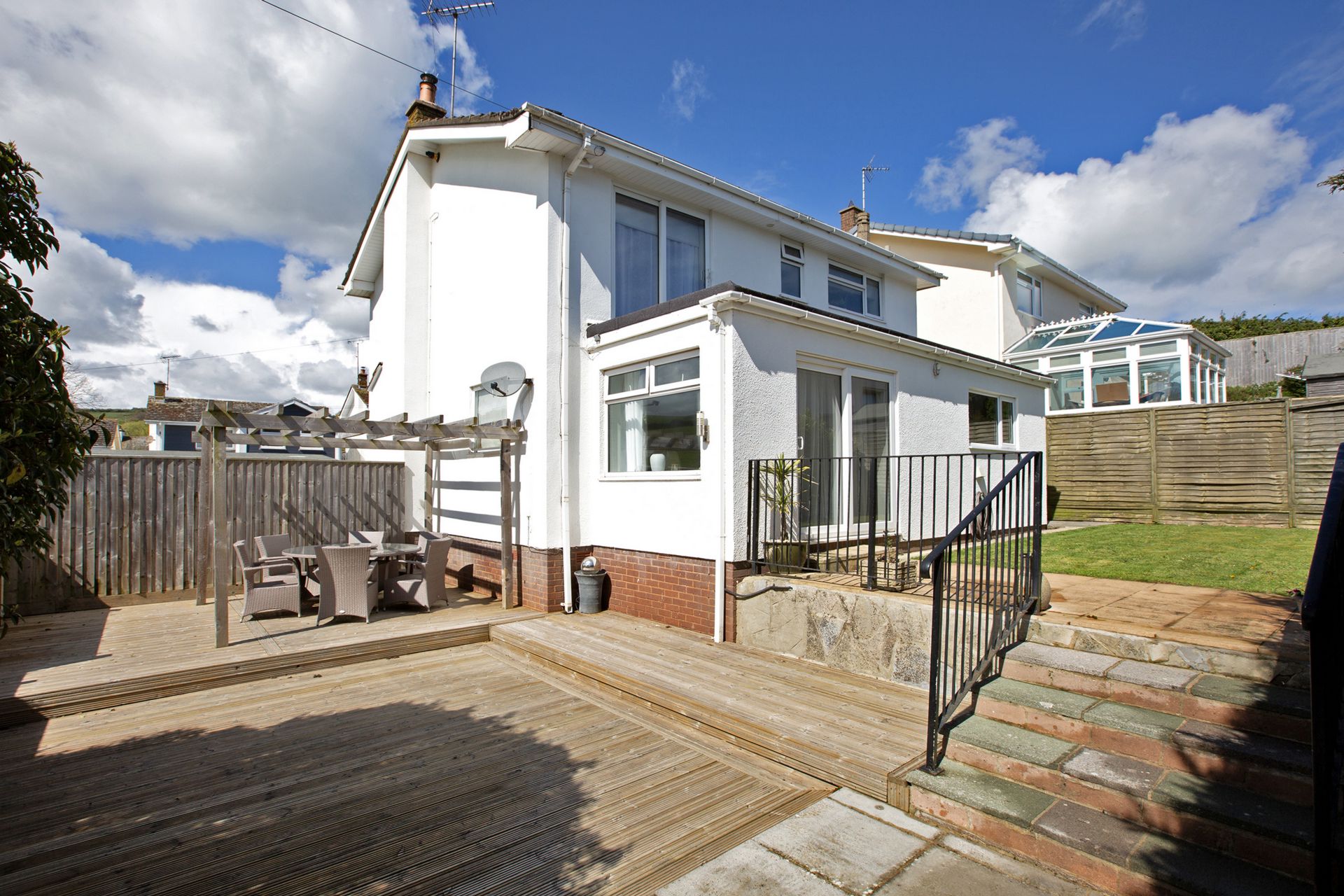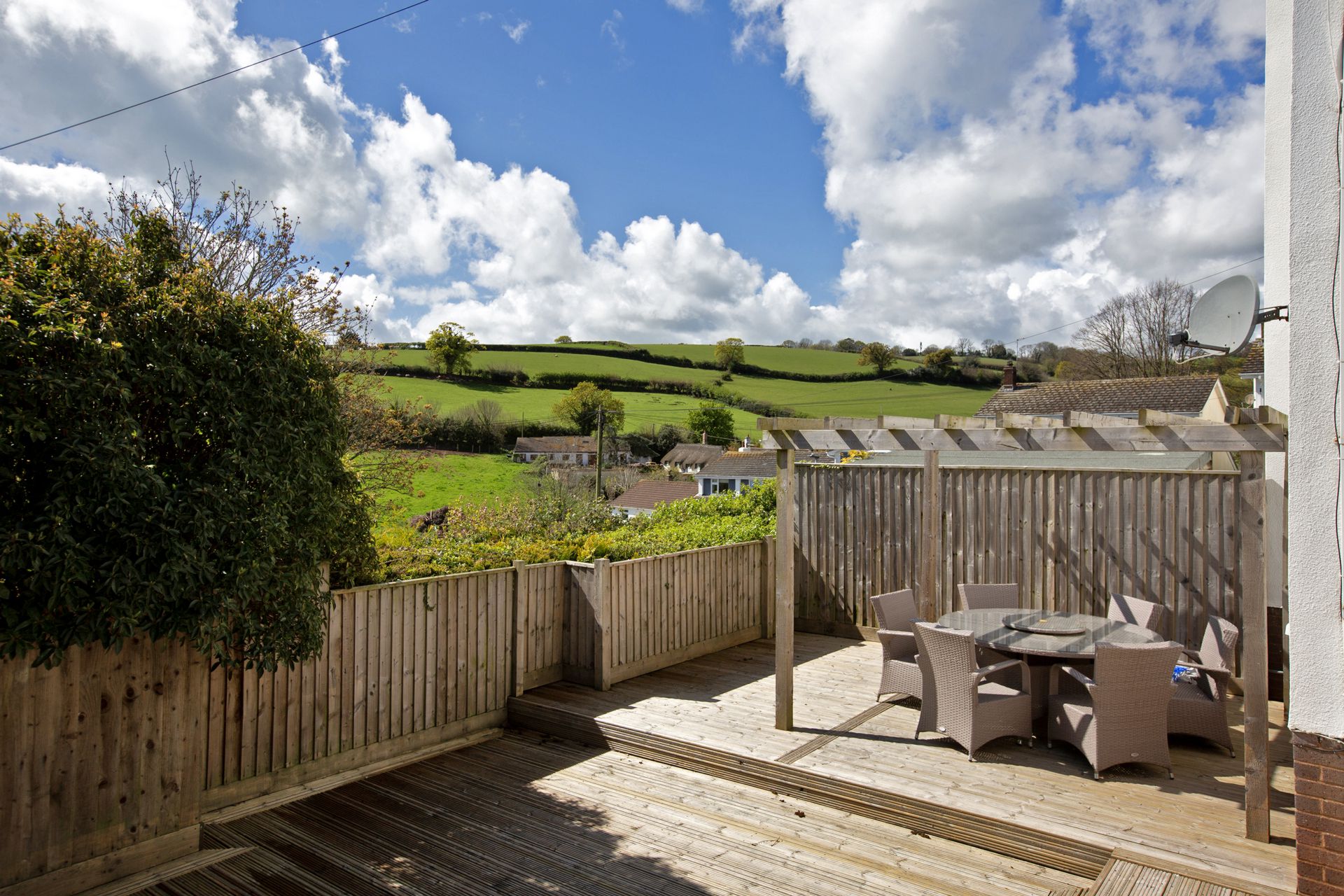 To the rear of the property is an area of secluded lawn and patio with steps down to a further patio area and extensive decking with pergola, creating an ideal space for relaxing or entertaining in the sunshine enjoying the views.