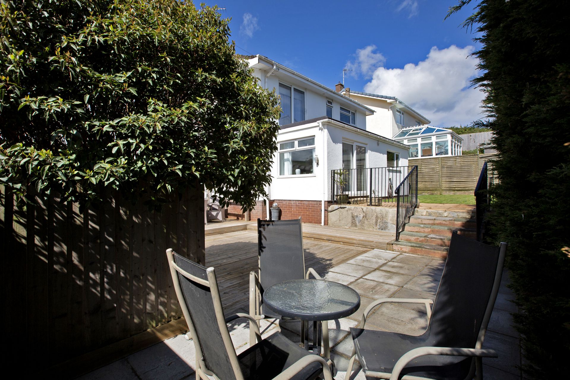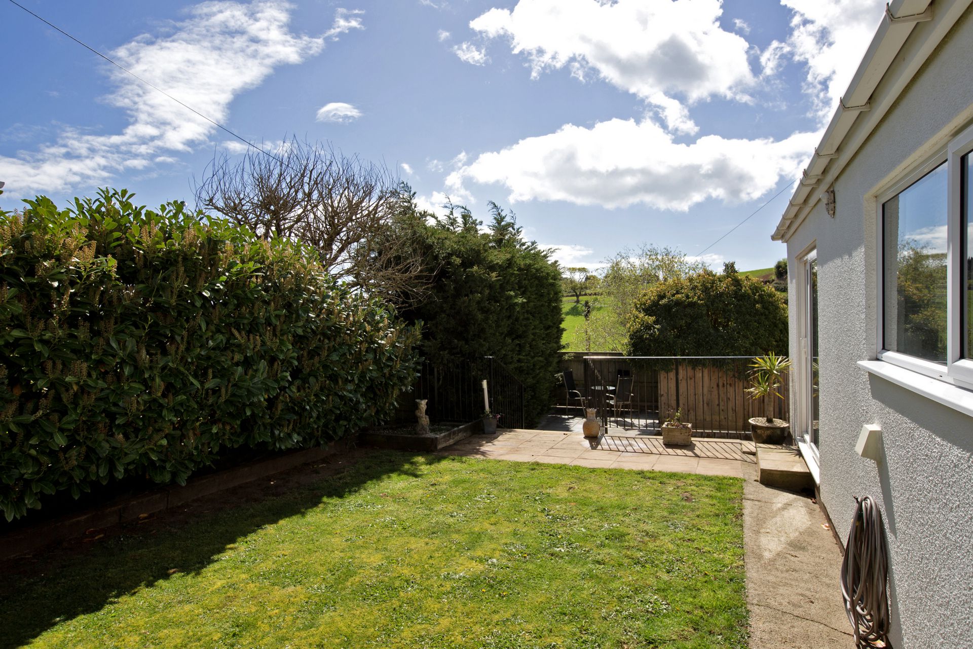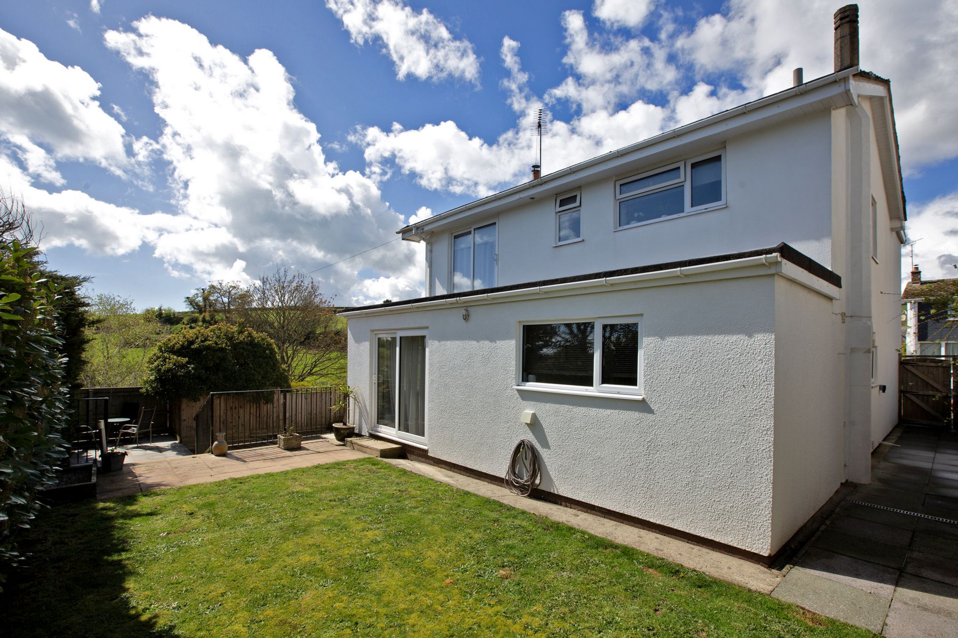 To the rear of the property is an area of secluded lawn and patio with steps down to a further patio area and extensive decking with pergola, creating an ideal space for relaxing or entertaining in the sunshine enjoying the views.