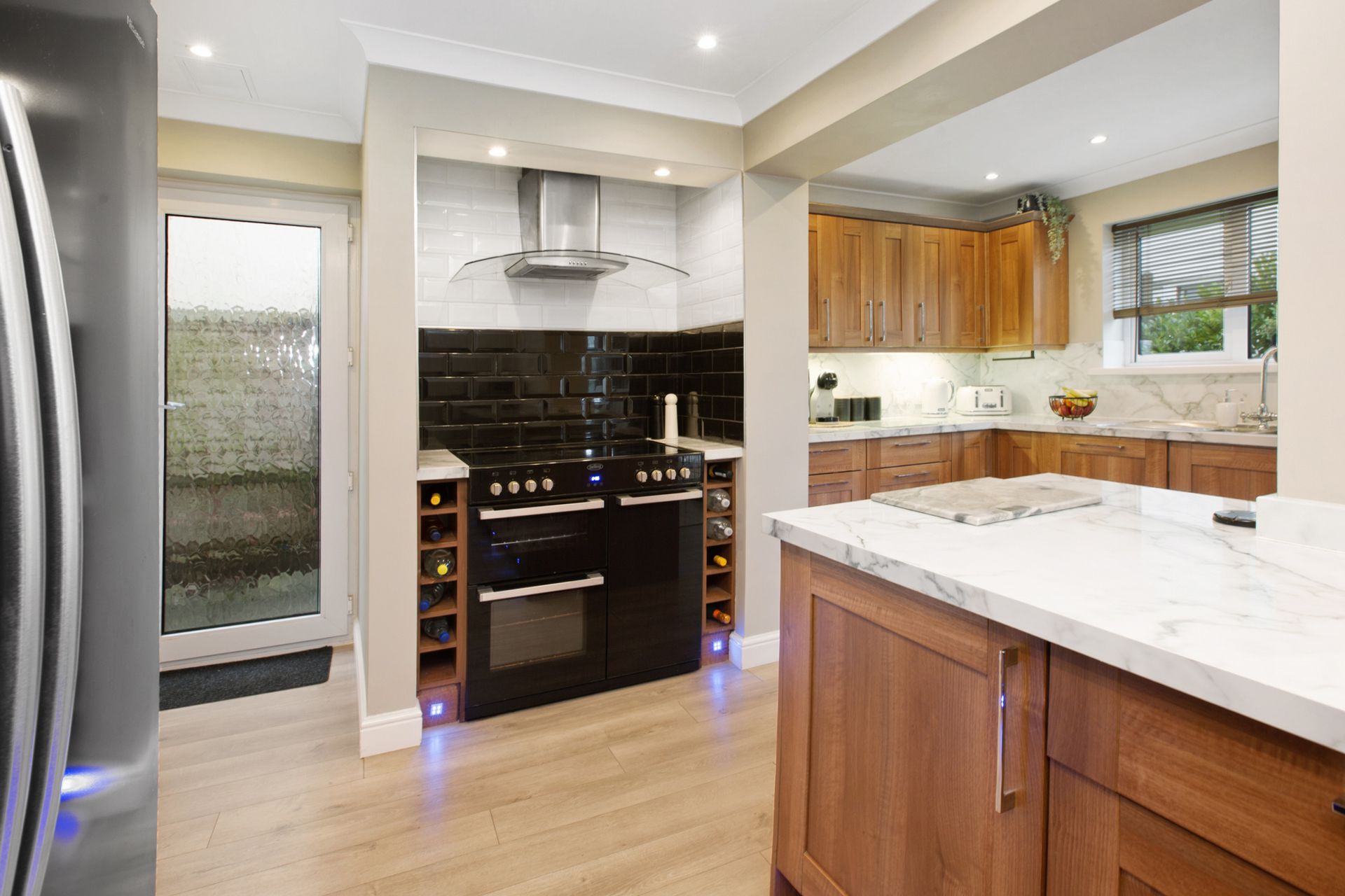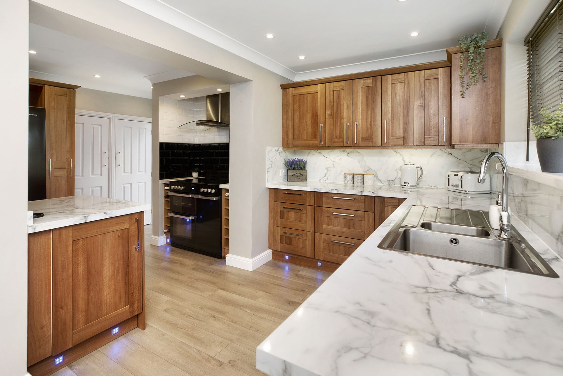 Kitchen/Breakfast Room: 7.56m x 5.00m (24'10" x 16'5") maximum, Fitted with a comrehensive range of cupboard and drawer base and wall units with marble effect work surfaces, space for range cooker and large fridge freezer, pantry cupboard, window overlooking the rear garden and door to side.