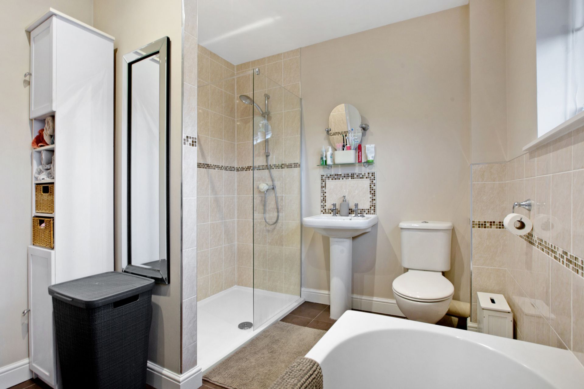 Bathroom: Fitted with a white suite comprising tiled panelled bath with tiled surround and shower attachment, shower cubicle, pedestal wash hand basin and WC. Opaque window.