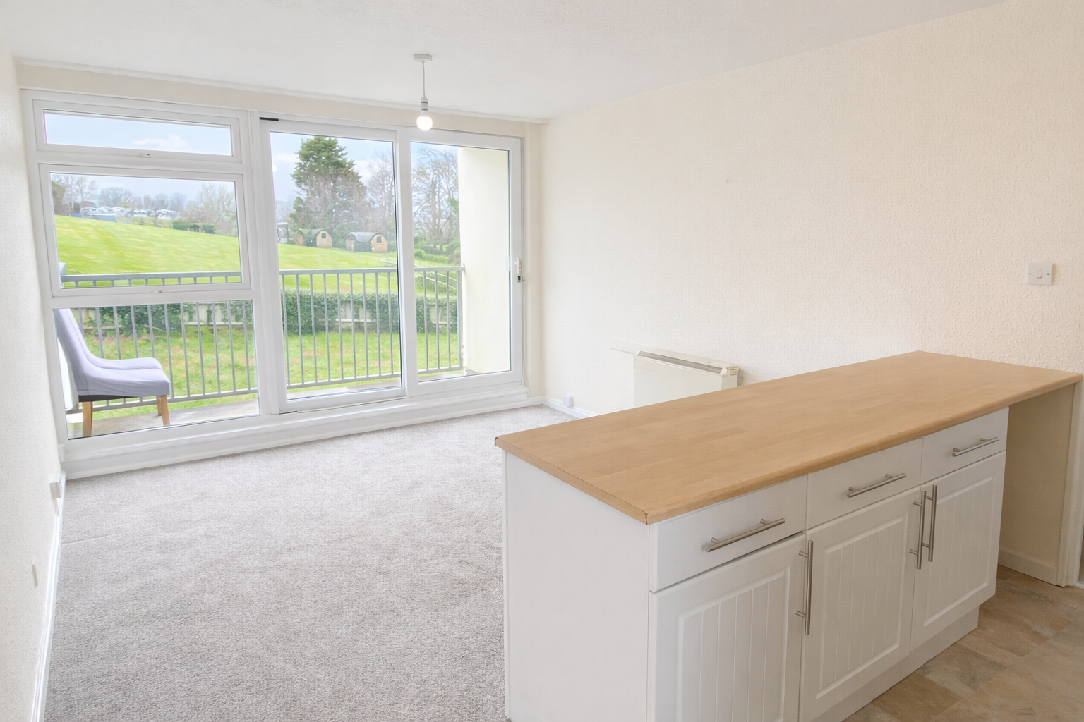 Entry to the property is into the open plan living room/kitchen which is a lovely bright room with large window and patio doors enjoying a pleasant outlook and opening onto the balcony, which provides the ideal place to enjoy the afternoon and evening sun. The kitchen is fitted with matching base and wall units and includes a built-in electric oven and hob.