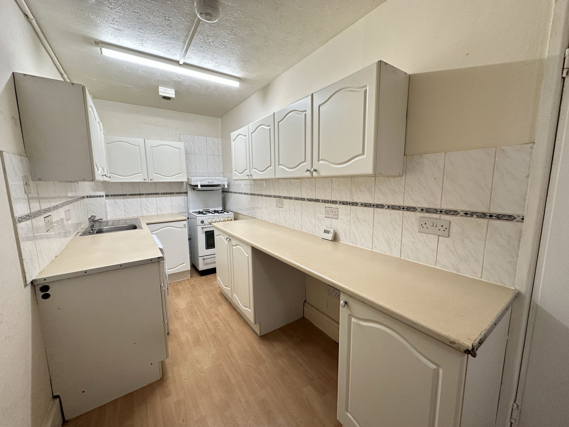 KITCHEN: 5.04m x 1.82m (16'6" x 5'12"), A selection of eye level and base units with roll top work surfaces over. Stainless steel sink and drainer, tiled splashbacks space and plumbing for washing machine, fridge/freezer and cooker. Extractor fan and good size storage cupboard.