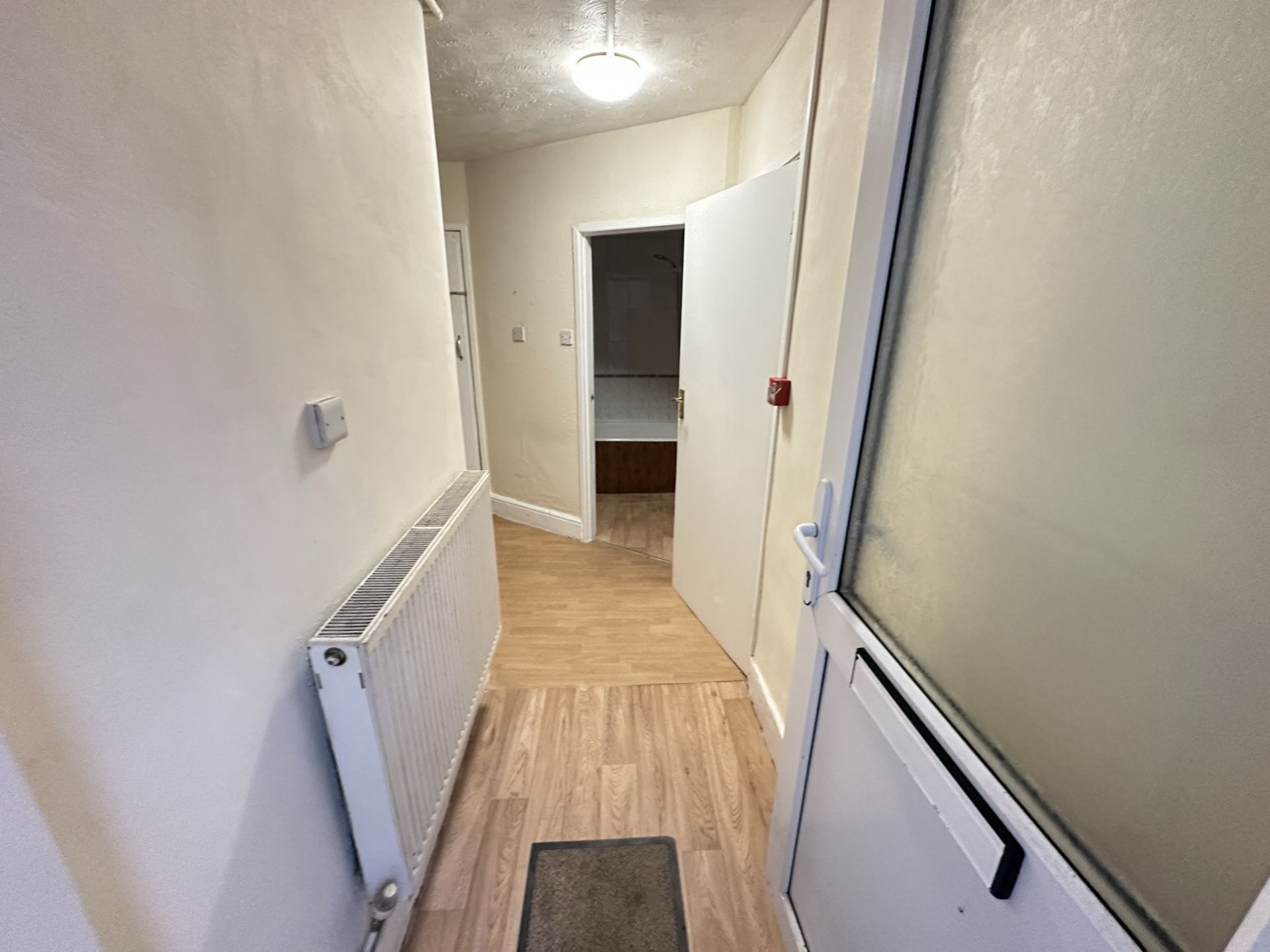 FRONT DOOR: Steps lead down to the uPVC double glazed front door. Opening to the entrance area with radiator and open to: