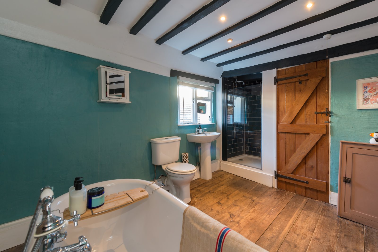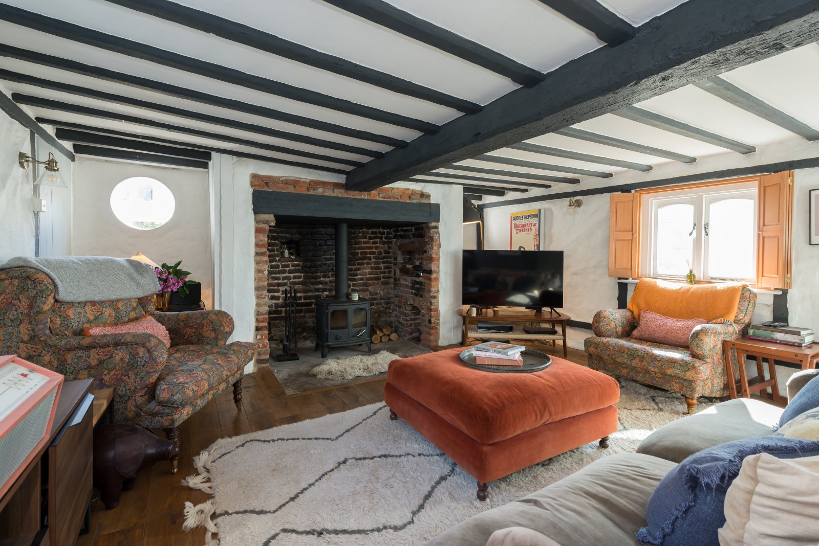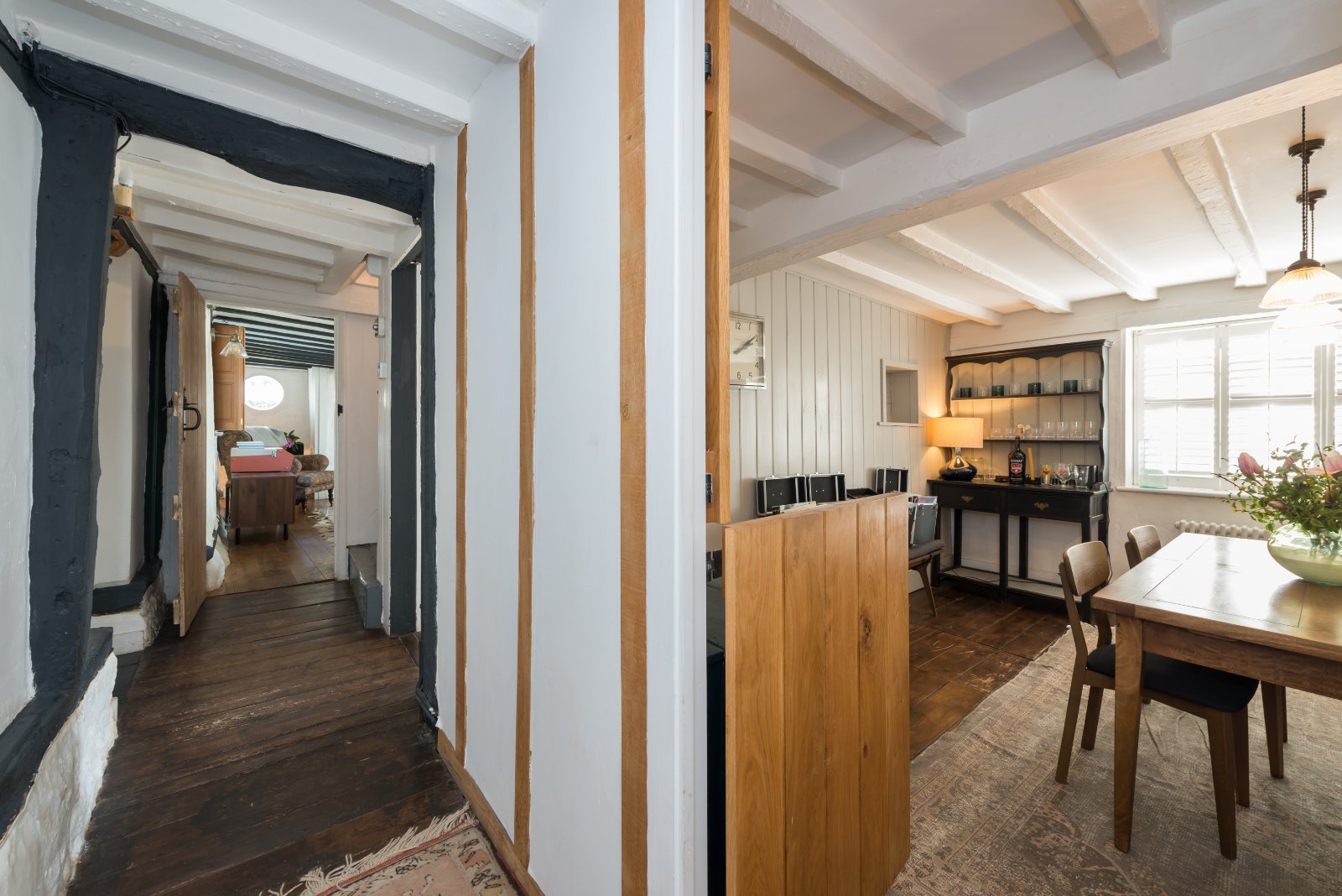 The property offers well proportioned and light-filled accommodation, unusual for much older properties, arranged over three floors. Period features remain a defining element, including exposed ceiling timbers, original floorboards and a striking inglenook fireplace fitted with a woodburning stove, creating a strong focal point to the principal reception room.