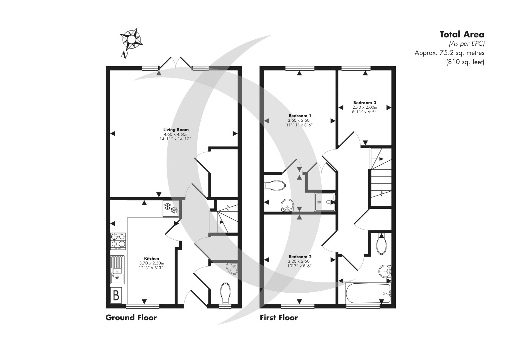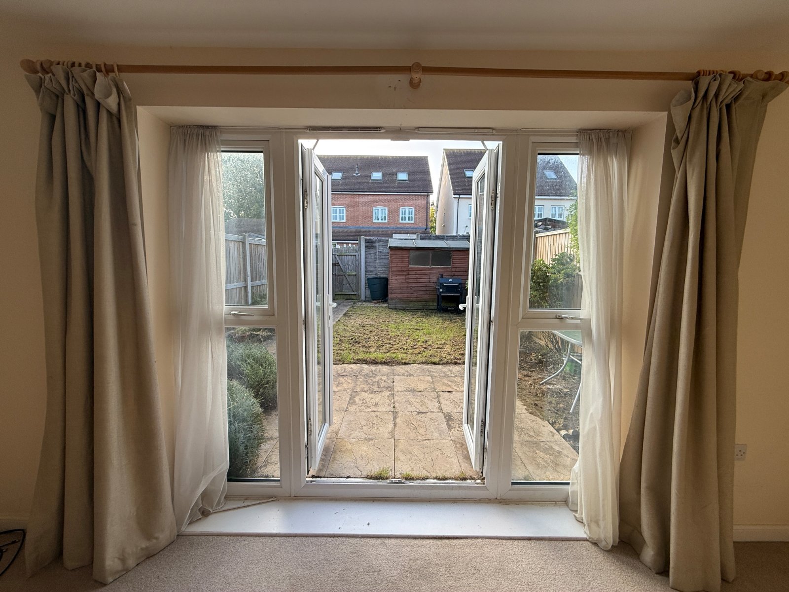 The front door opens to the entrance hall with built-in cupboard and guest WC. The L-shaped living room, wth built-in under stairs cupboard, has double doors opening on to the garden. The kitchen is fully fitted with white units, a gas hob and built-in electric oven, together with an Integrated fridge/freezer. A wall cupboard houses the gas fired boiler.