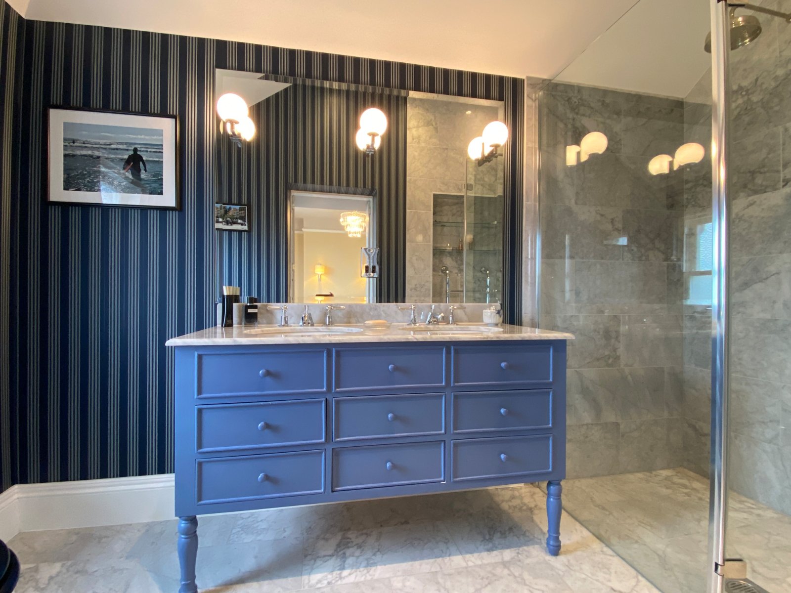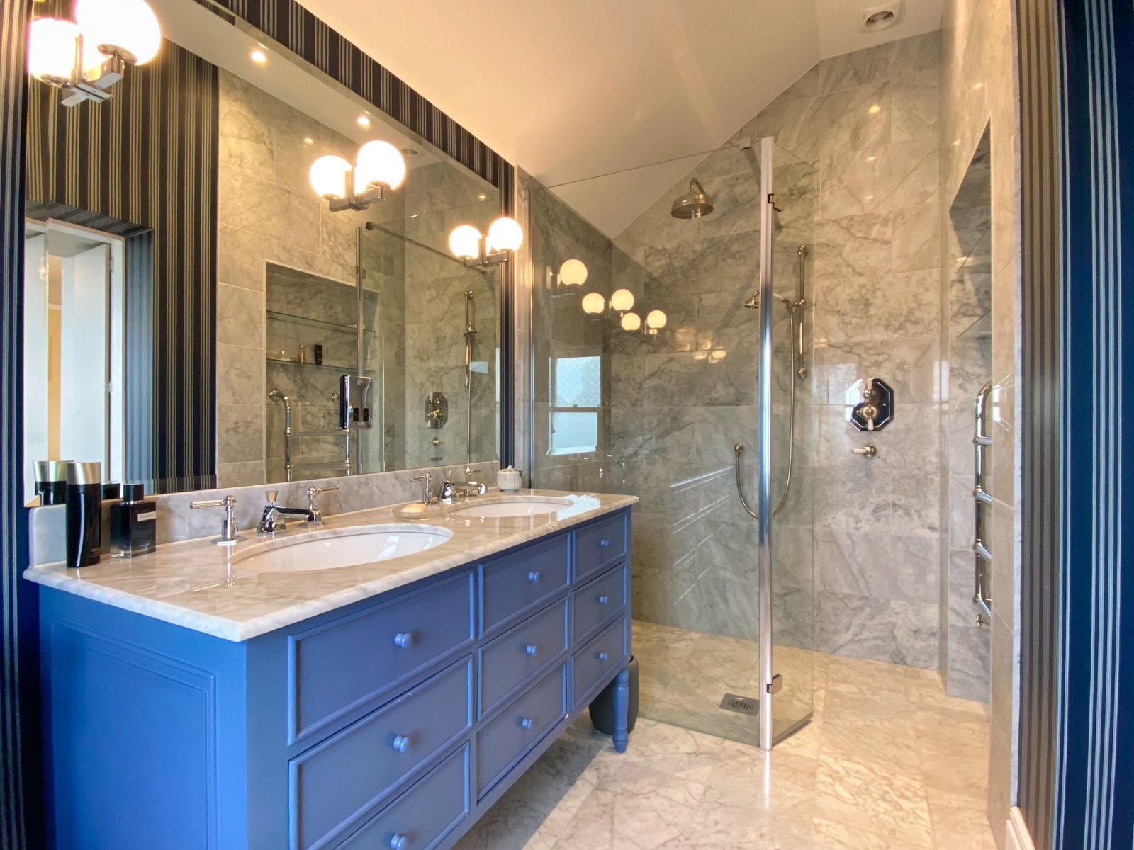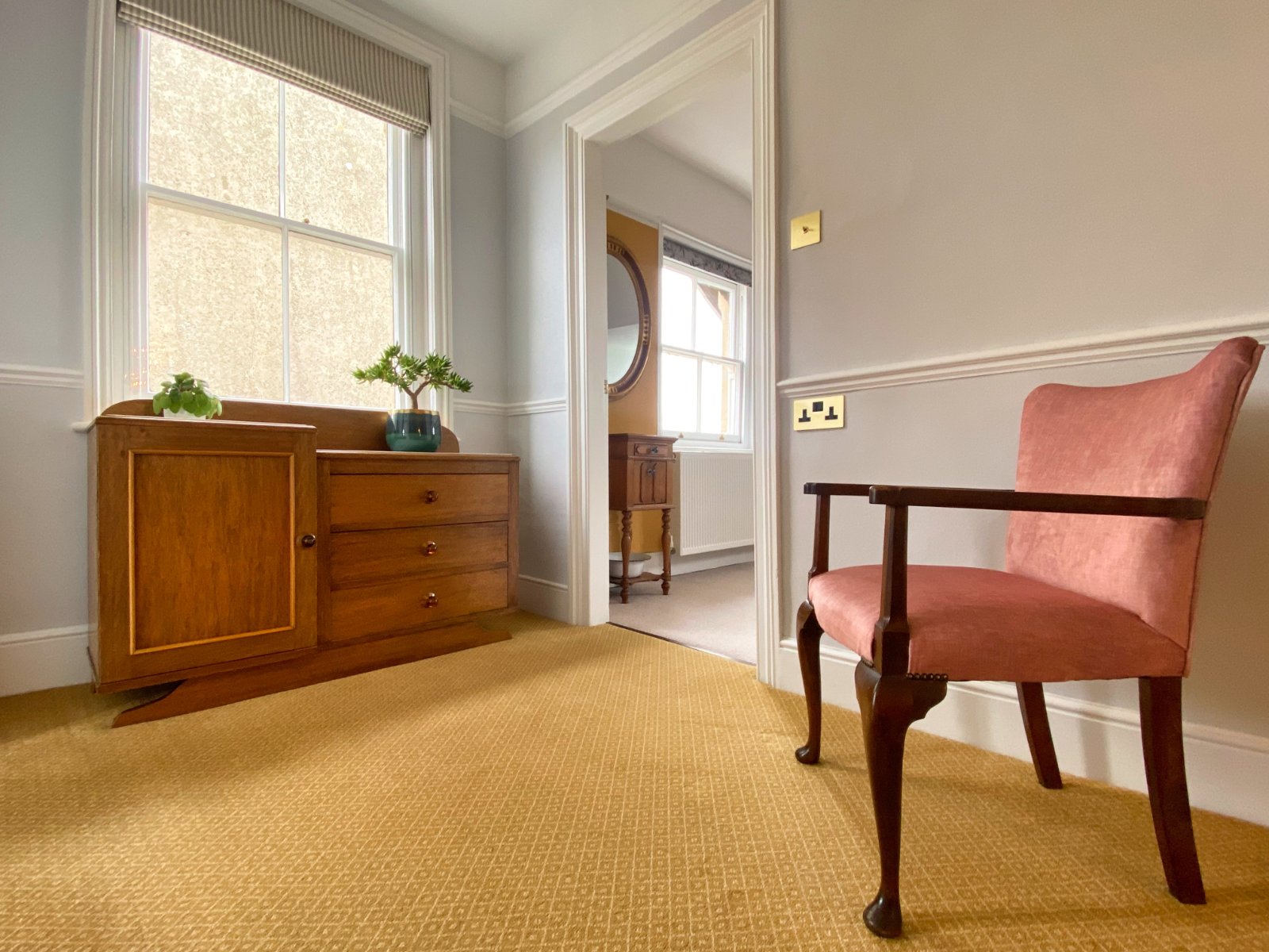 Upstairs, the principal bedroom is a standout space, calm, spacious and bathed in light, featuring a tall bay window that frames views over the rear garden and beyond. Its en-suite shower room is beautifully appointed with Carrera marble, bespoke cabinetry, heated towel rails, Perrin & Rowe shower, Lefroy Brooks and Barber Wilson fittings. A second double bedroom at the front enjoys views across the croquet lawns and is equally impressive. The family bathroom mirrors the home’s exacting standards, with Carrera marble tiling, a Fired Earth pedestal basin and a bath with overhead shower beneath a Velux skylight, which floods the room with natural light.