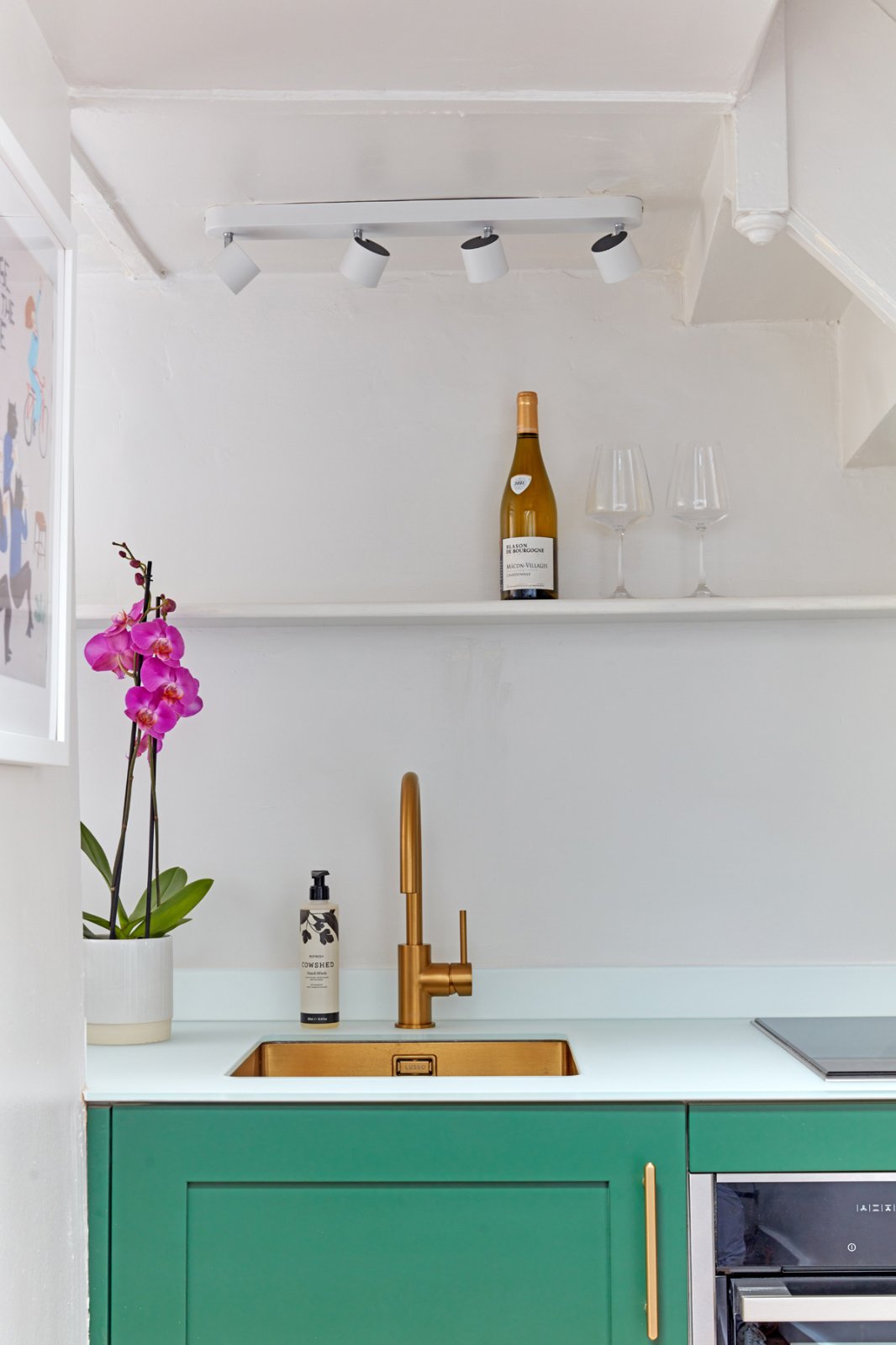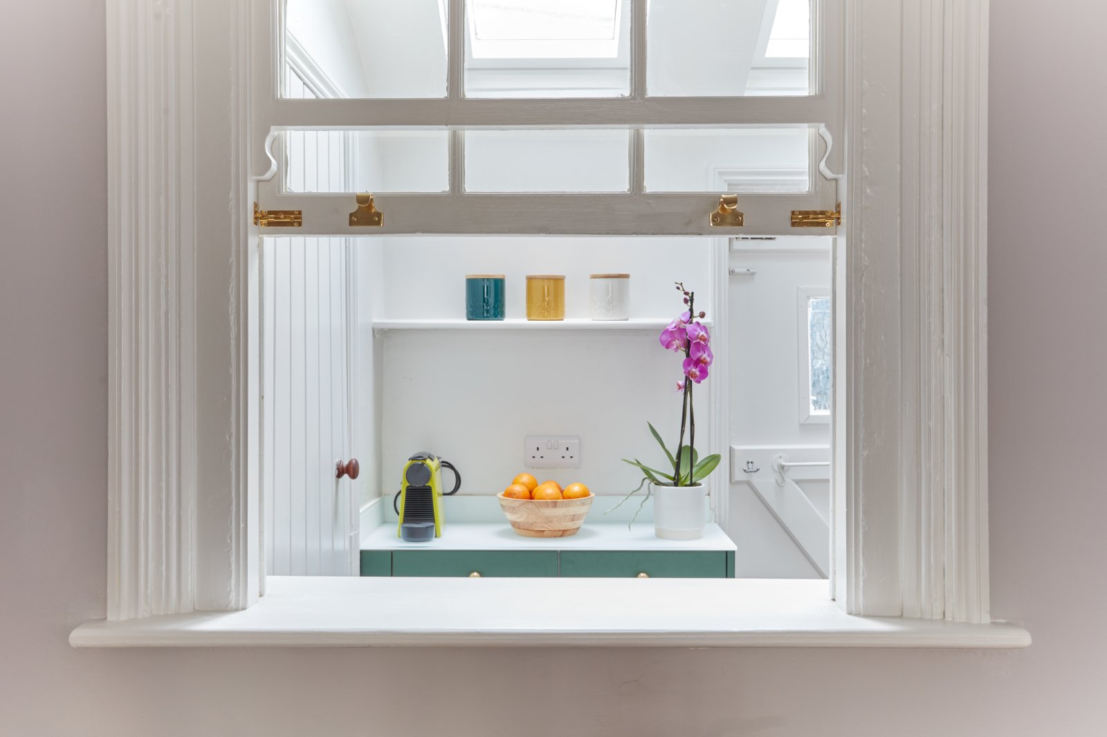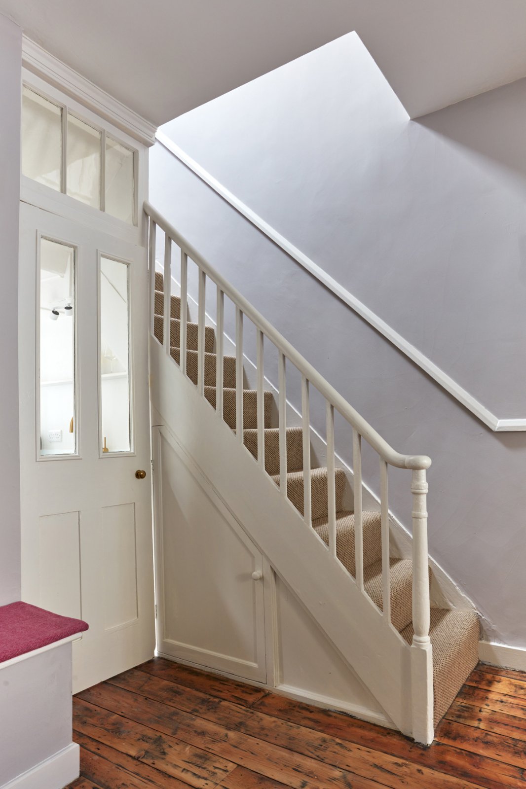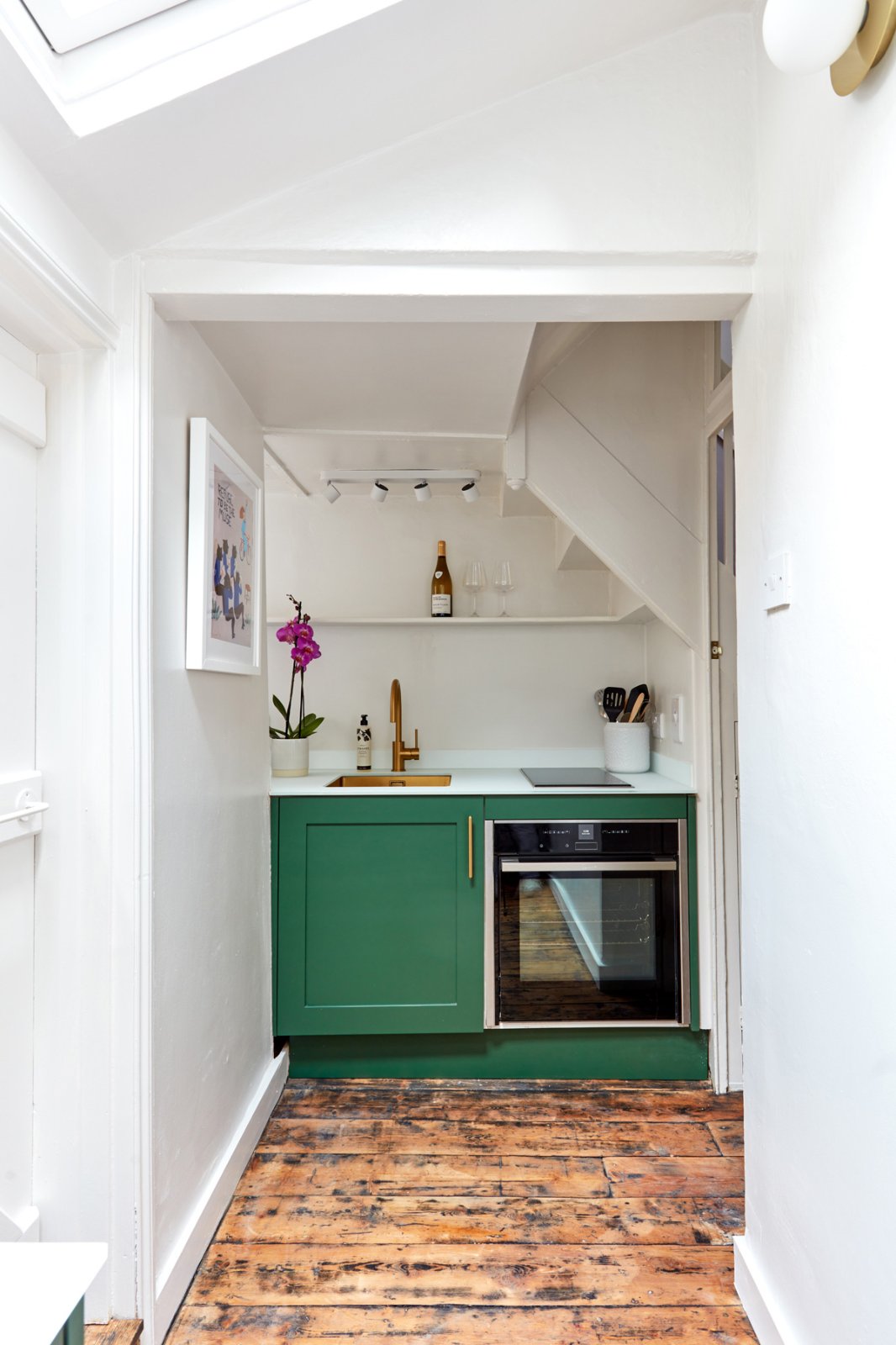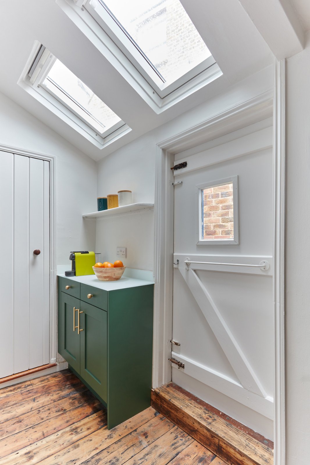 The dining space to the rear of the room provides built-in storage to either side of the chimney breast and a sash window connecting to the kitchen. The kitchen is compact, but well ppointed with bespoke cabinet doors, glass worktop and Neff induction hob and oven with 'hide and slide' door. Skylights give a feeling of space and light, and the back door gives access to a passage at the rear. A larder cupboard offers storage space, with space and plumbing for a small washing machine.