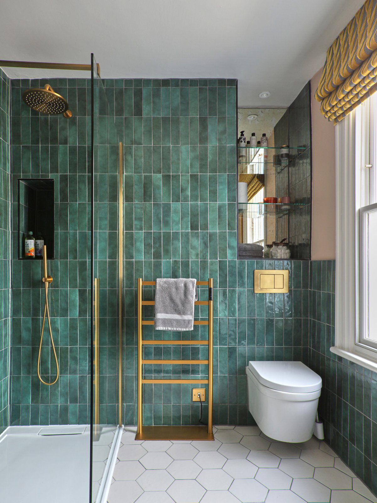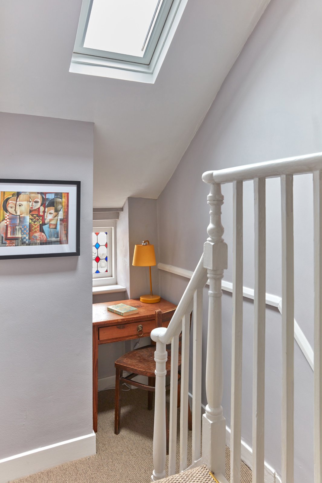 The stairs lead from the reception room to a split level landing with attractive stain glass window to the rear before carrying on to the bathroom. Complete with walk- in drench shower, underfloor heating and a heated/illuminated vanity mirror