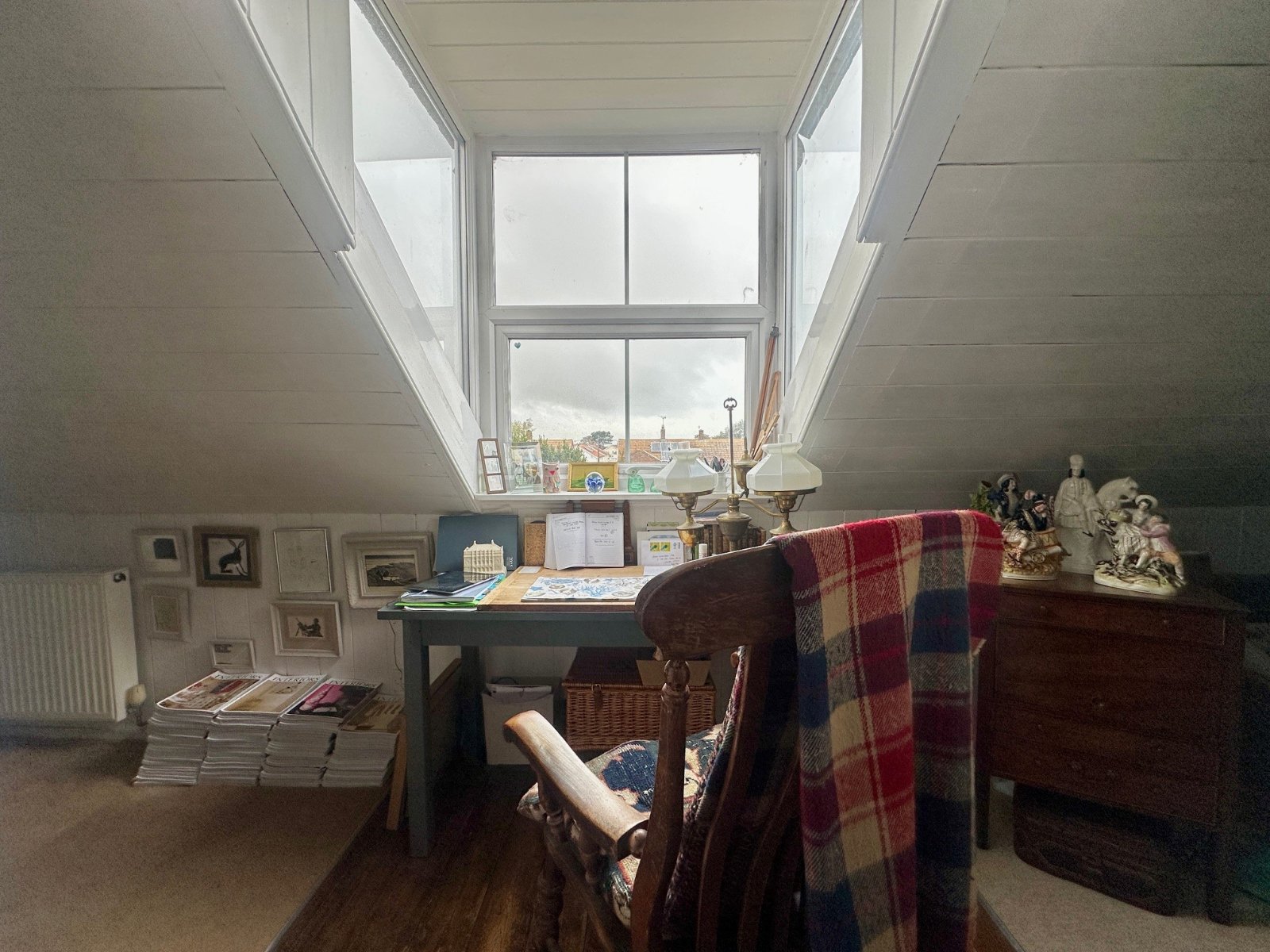 The upper floor provides a versatile additional room, ideal for use as a study, craft room or reading nook, with an adjoining loft space offering useful storage.