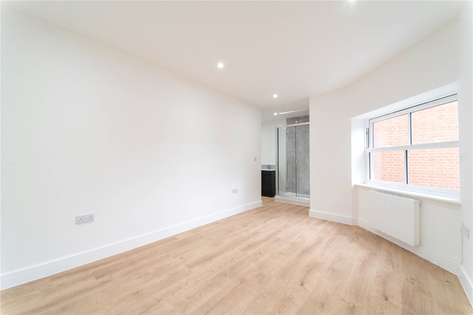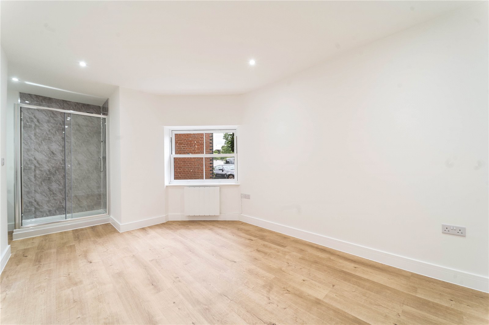 A well-proportioned double bedroom sits to the rear of the apartment, offering a peaceful retreat with direct access to an en-suite shower room. The en-suite has been finished to a high standard, with a spacious walk-in shower and elegant fittings that complement the minimalist design.