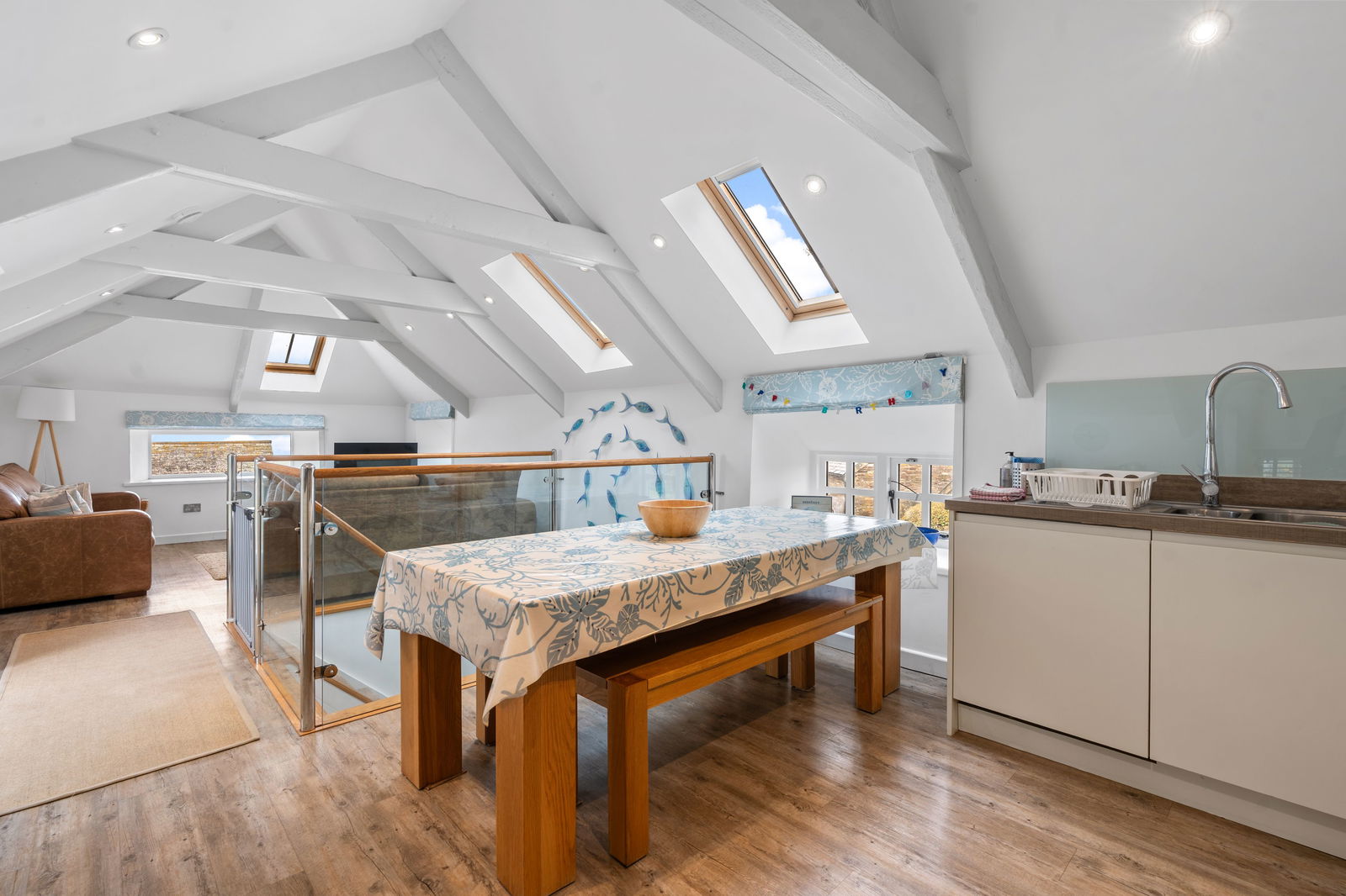 - Feature Open Plan Living/Dining/Kitchen with Fully Fitted Kitchen with Built-in Appliances, Vaulted Ceiling and Exposed Timber Beams