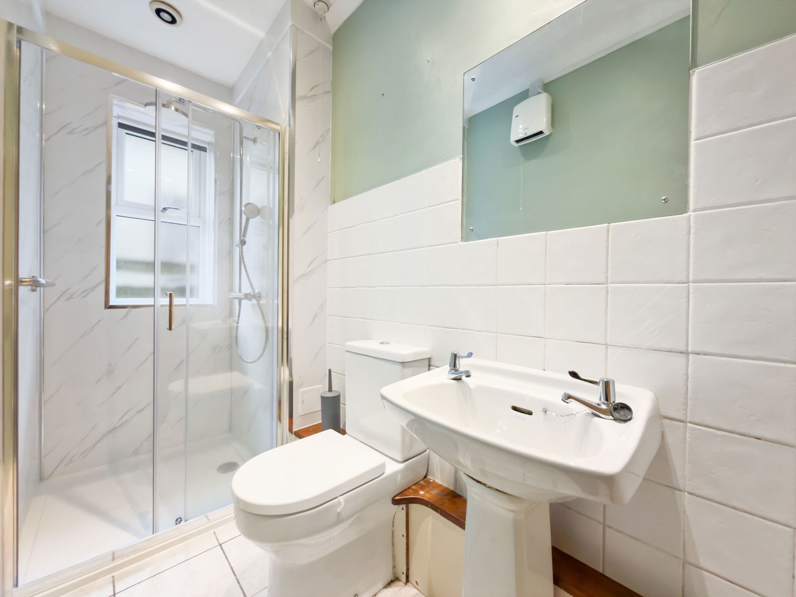 Part tiled with walk-in shower cubicle with rainfall shower head, opaque UPVC double glazed window to side, low level W.C., wash hand basin.