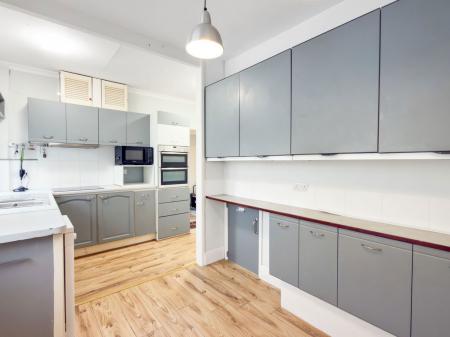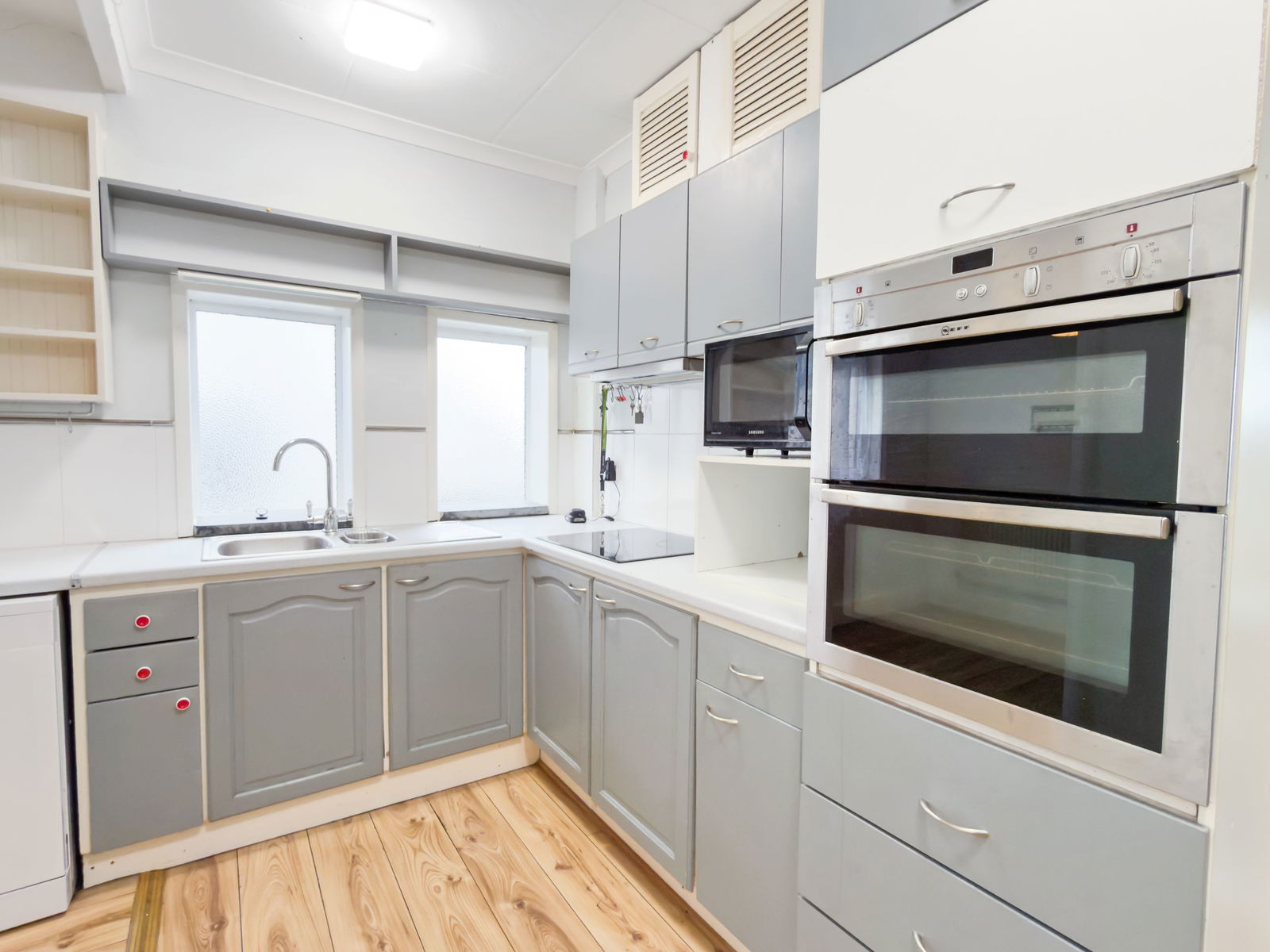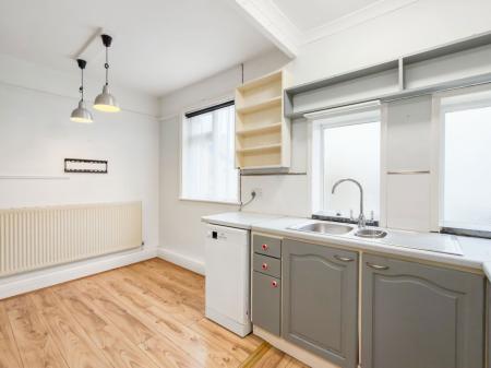 Fitted kitchen with a good range of wall and base cupboards with drawers and worktops over, eye level Neff double oven with 4 ring hob with extractor fan over, one and a half bowl stainless steel sink, mixer tap, Beko slimline dishwasher, radiator, 3 UPVC double glazed windows to side (2 opaque) and dining area.