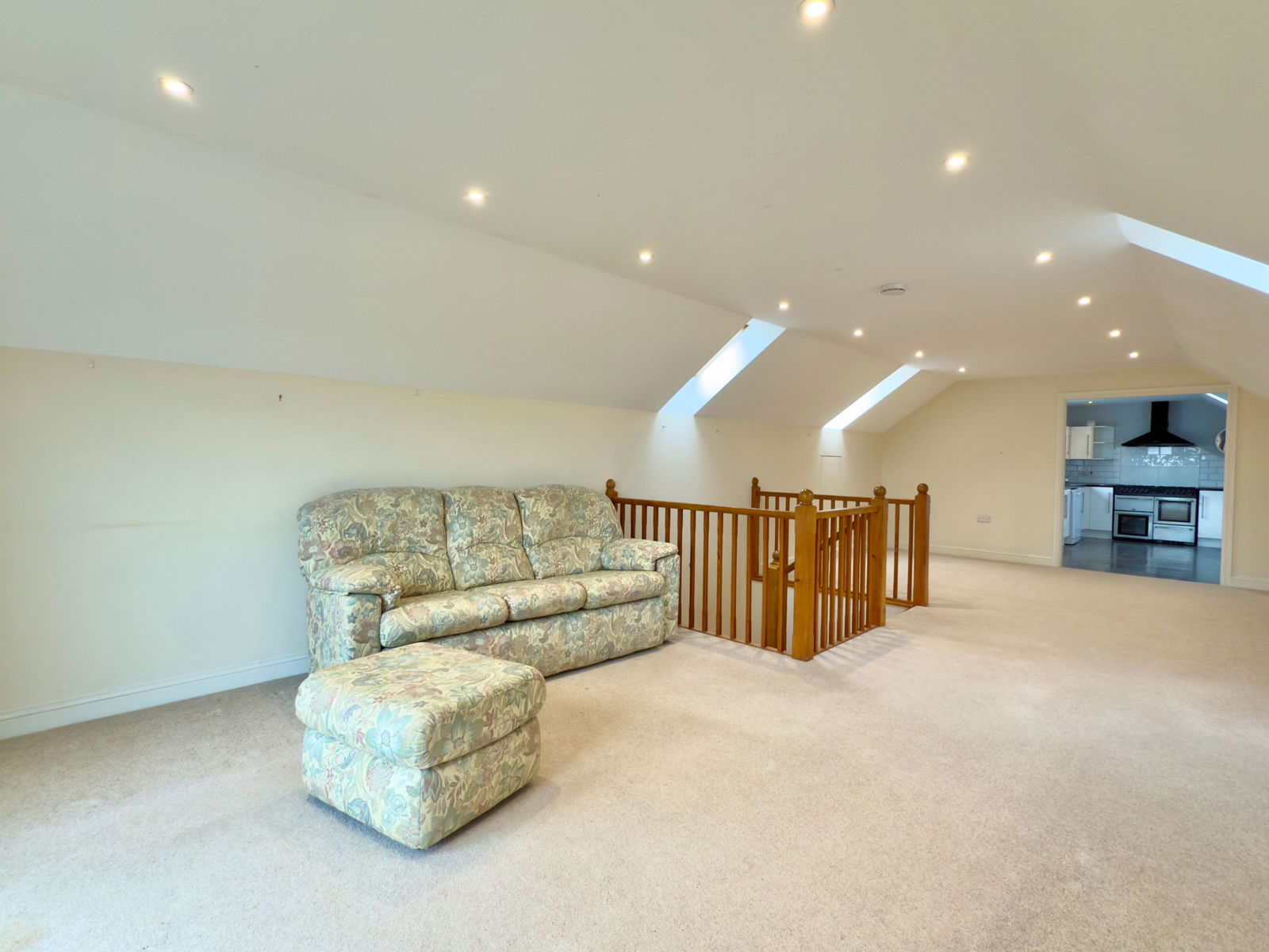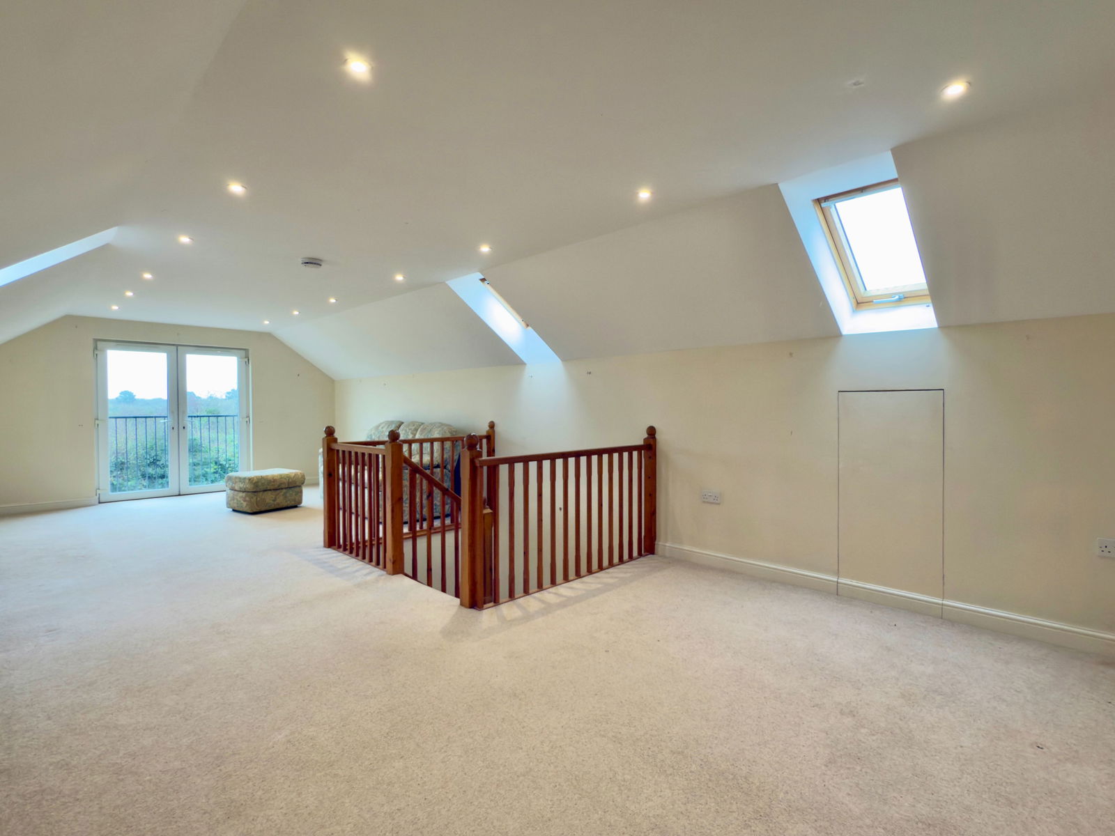 Spacious and light room with patio doors with Juliet balcony overlooking the rear garden, 4 Velux windows above, recessed loft storage, ample space for living and dining room furniture.