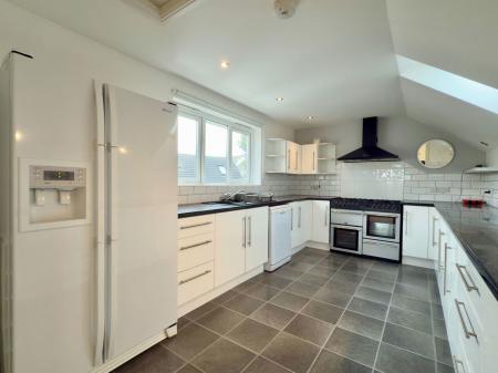 UPVC double glazed window to side, Velux window above, excellent modern fitted kitchen with a great range of wall and base cupboards with worktops over, sink with mixer tap, space and plumbing for American style fridge/freezer, inset dishwasher, freestanding gas cooker with extractor fan above.