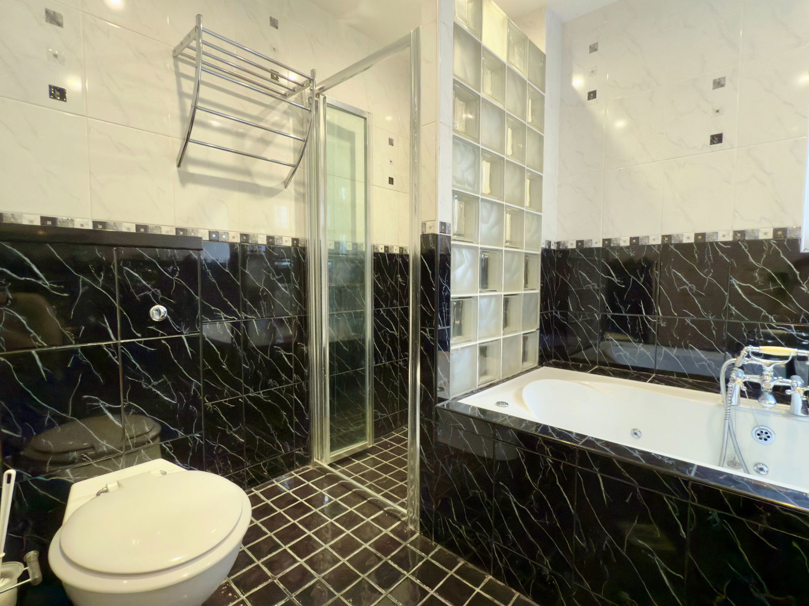 Opaque UPVC double glazed window to side, fully tiled with drain, shower, separate jacuzzi bath, wash hand basin and W.C..
