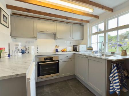A beautiful modern fitted kitchen with a good range of wall and base cupboards with drawers and worktops over. Integral AEG electric oven with 4 ring AEG induction hob with filtration hood over. Stainless steel sink with drainer and mixer tap over. Window overlooking the rear garden. Door to rear garden.