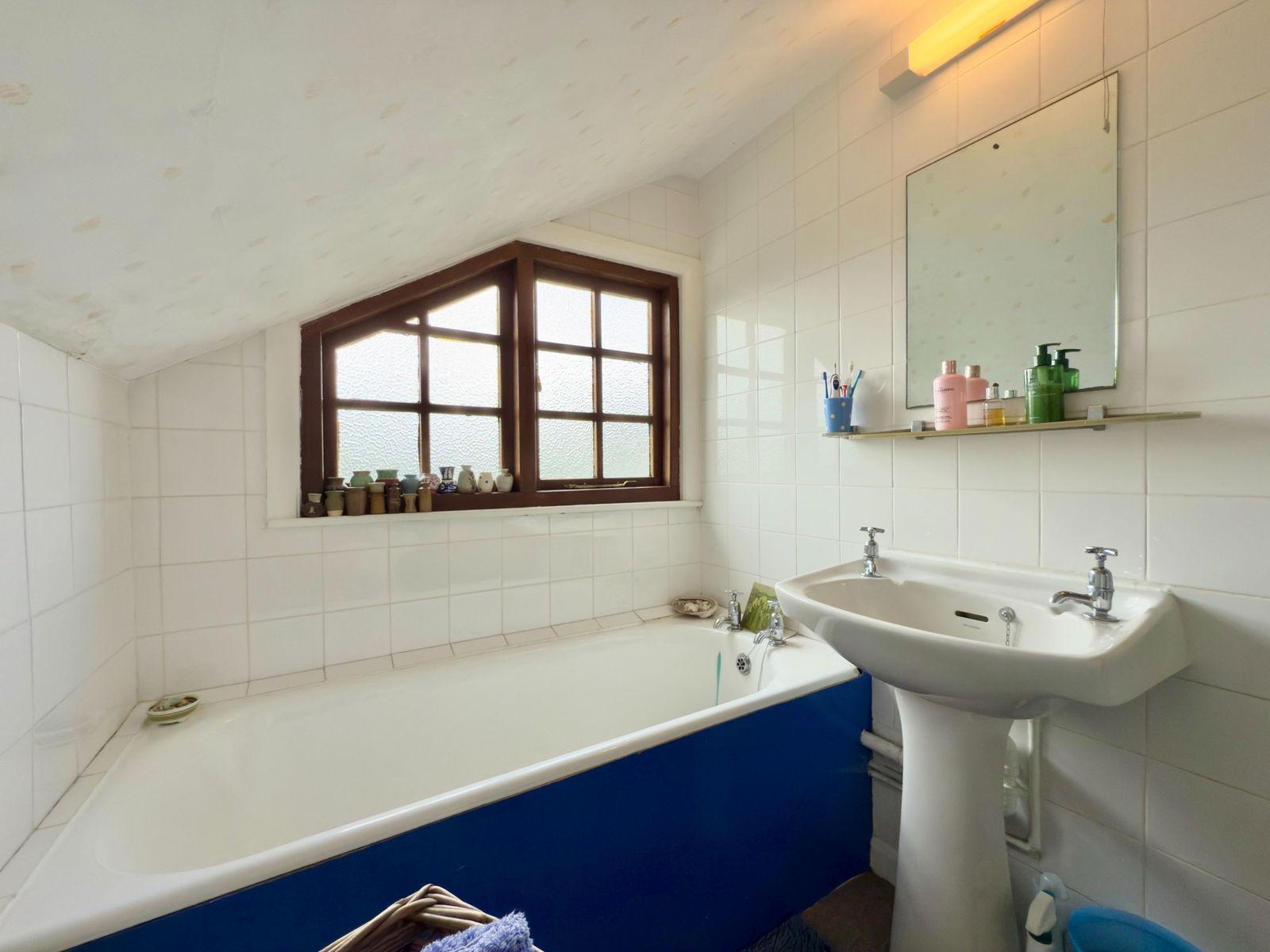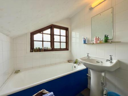 Panelled bath. Wash hand basin. Airing cupboard housing hot water tank with shelving above. Opaque window to rear.