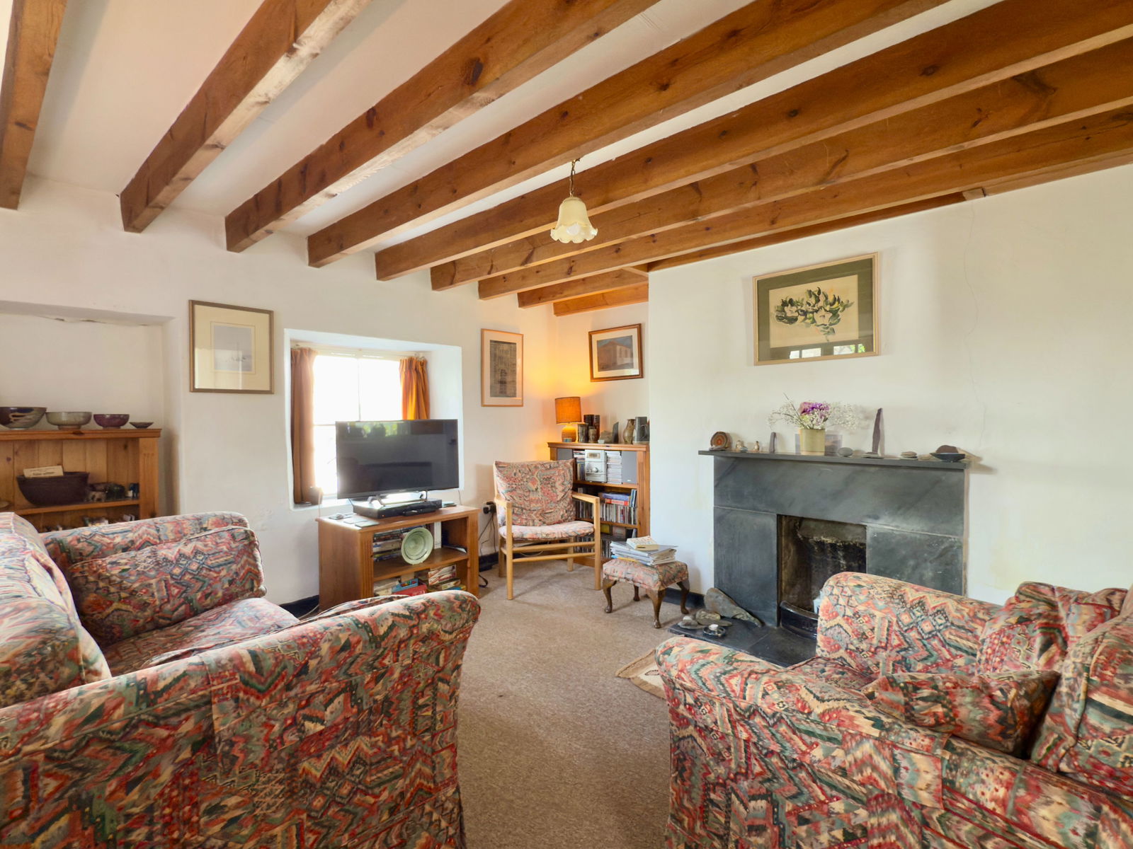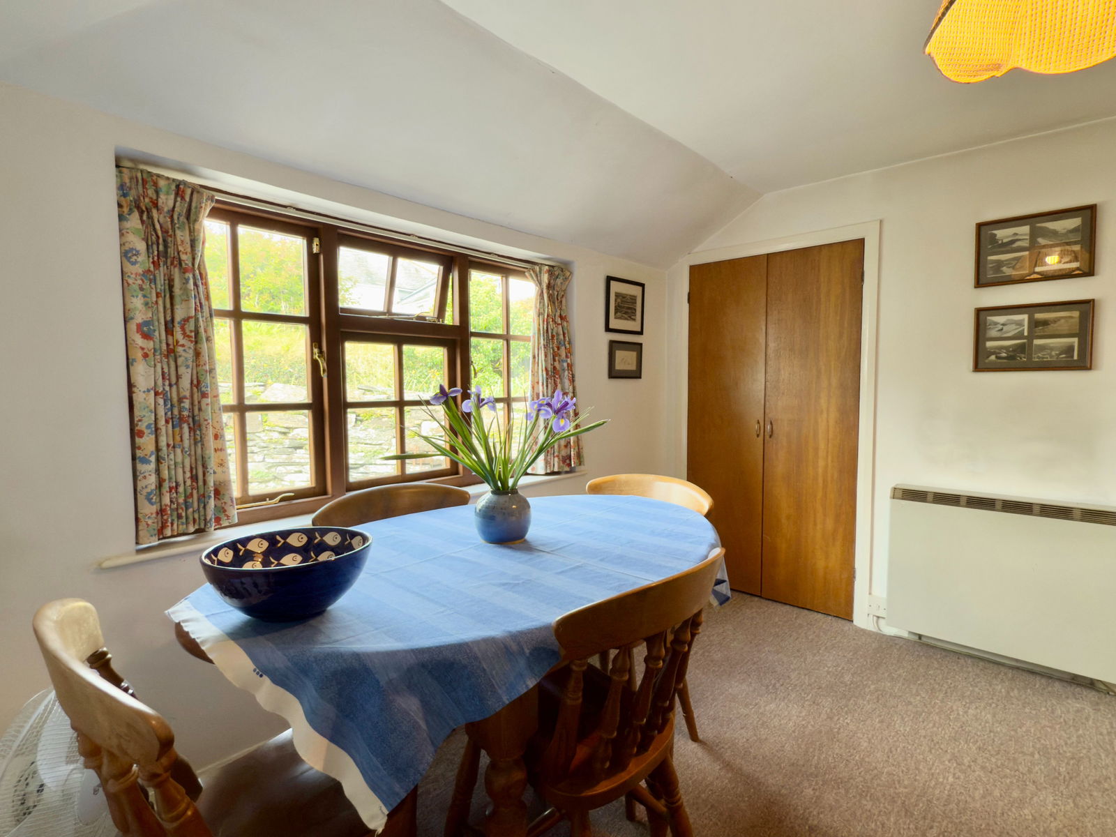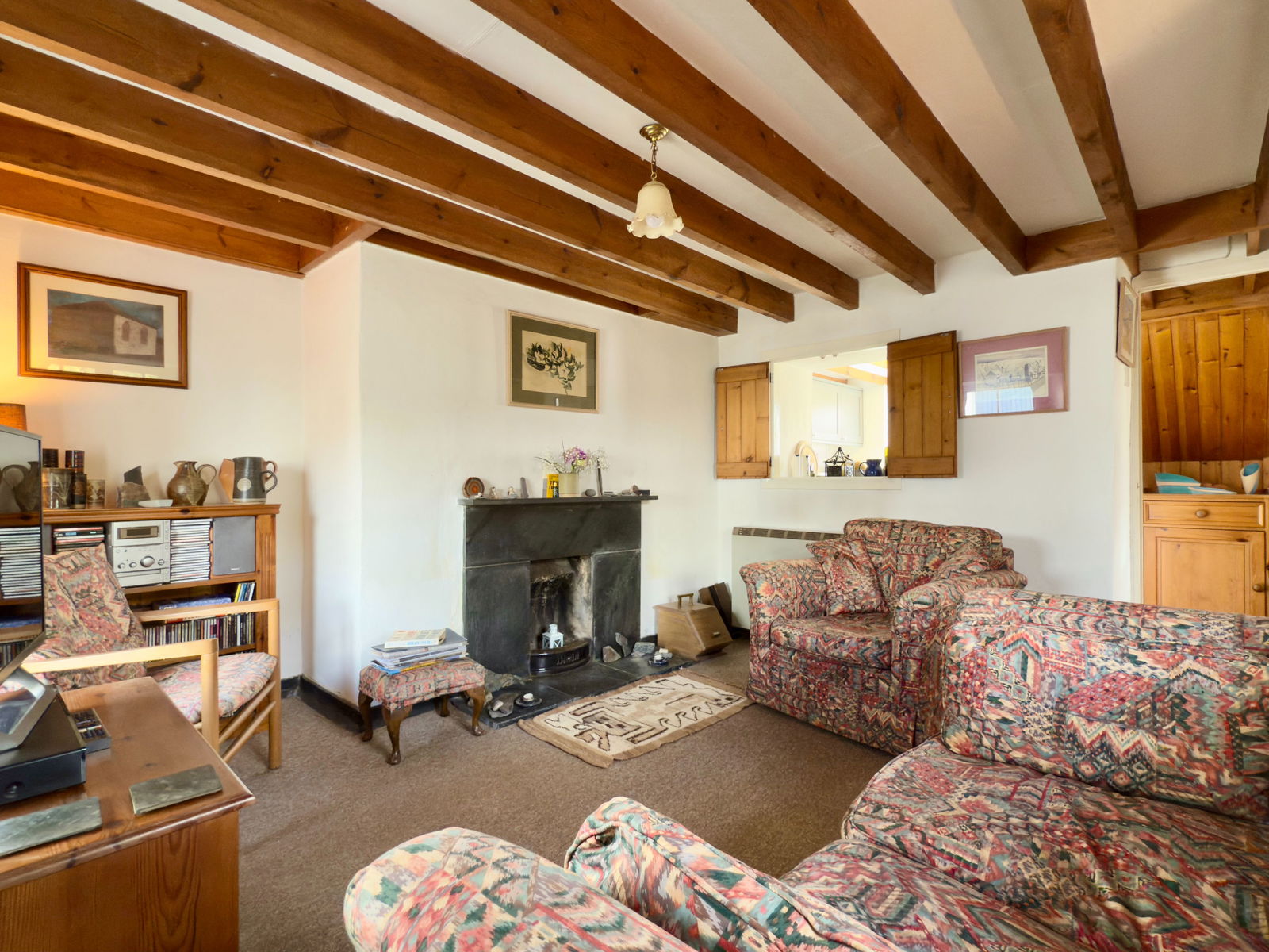 A lovely dual aspect room with feature fireplace with open fire set on slate hearth and beamed ceilings above. Night storage heater. Serving hatch to the kitchen. Door to