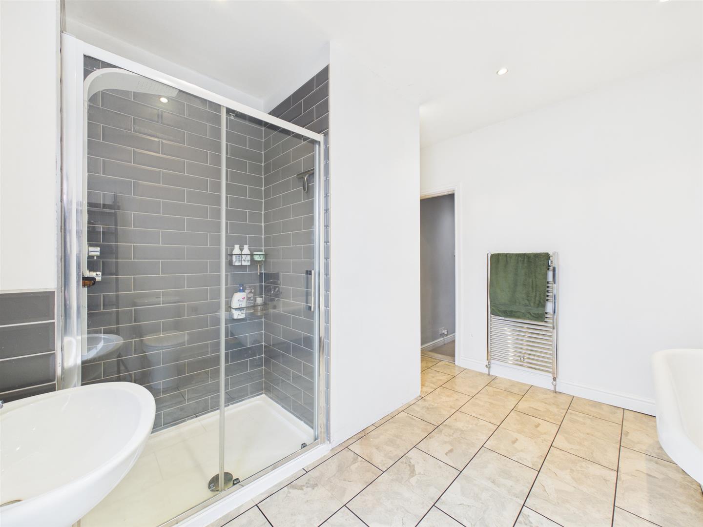 Bathroom - 3.40 x 3.18 (11'1" x 10'5") - A spacious room with a suite comprising low flush WC, pedestal wash handbasin, free standing roll edge claw foot bath with shower attachment, separate shower cubicle, chrome towel radiator, appliance space suitable for washing machine and tumble dryer and double glazed door to rear.