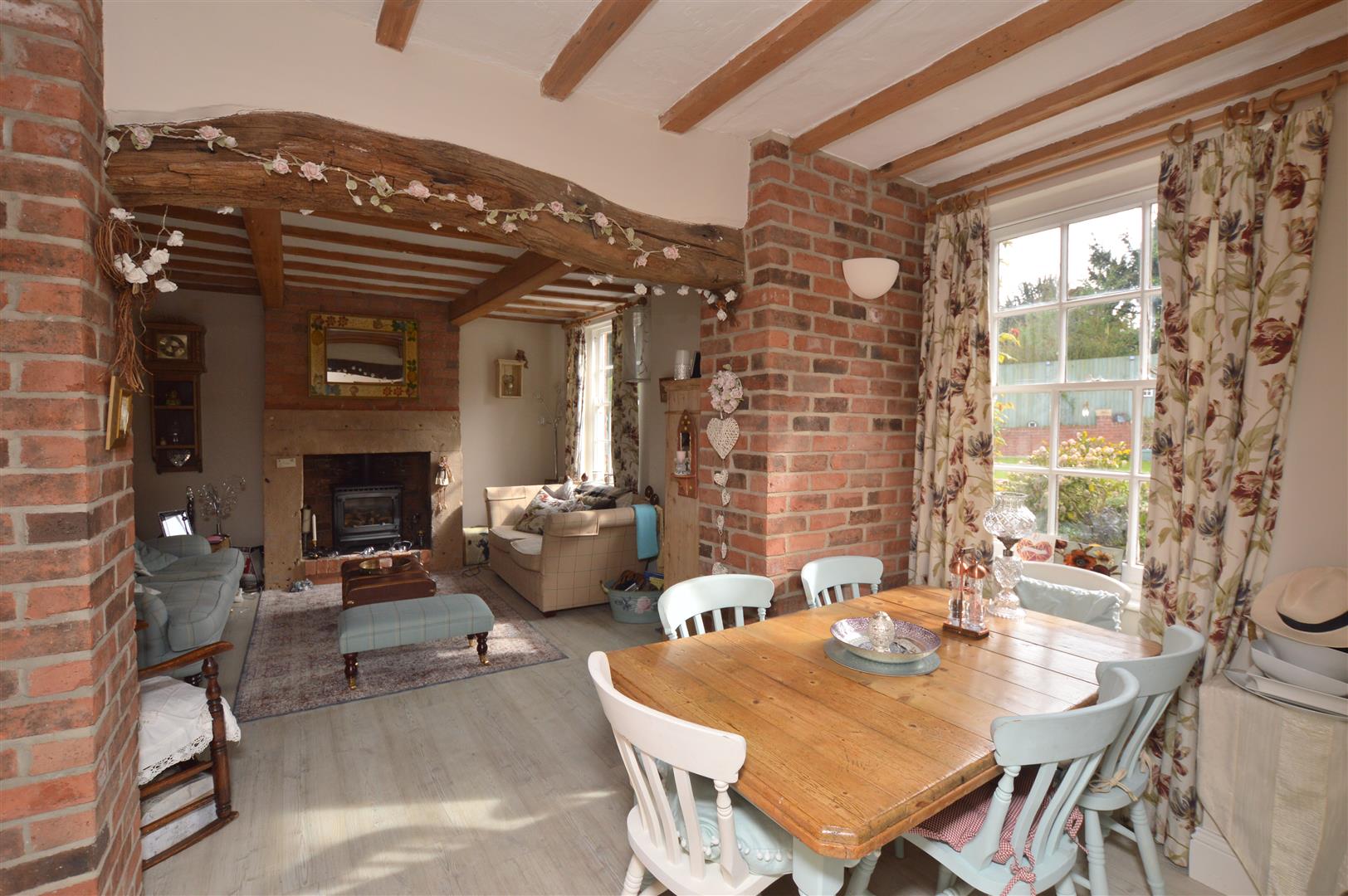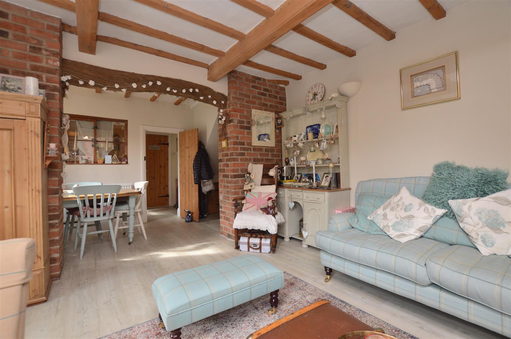 Dining Room - 3.91m x 1.80m (12'9" x 5'10") - With radiator, revealed ceiling beams, fitted wall lights, useful understairs storage cupboard, internal sliding glass window acting as a serving hatch to the kitchen, multi-paned sash window, internal latched door, matching exposed brick archway incorporating beam opening back into the lounge.
