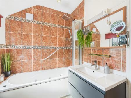 Family Bathroom - 2.44 x 1.87 (8'0" x 6'1" ) - With spa bath with chrome mixer tap/hand shower attachment and additional electric shower over with shower screen door, fitted wash basin with fitted base cupboards underneath, low level WC, tiled splash-backs, high ceilings, heated chrome towel rail/radiator, concealed central heating boiler, extractor fan, double glazed obscure window and internal oak veneer door with chrome fittings.