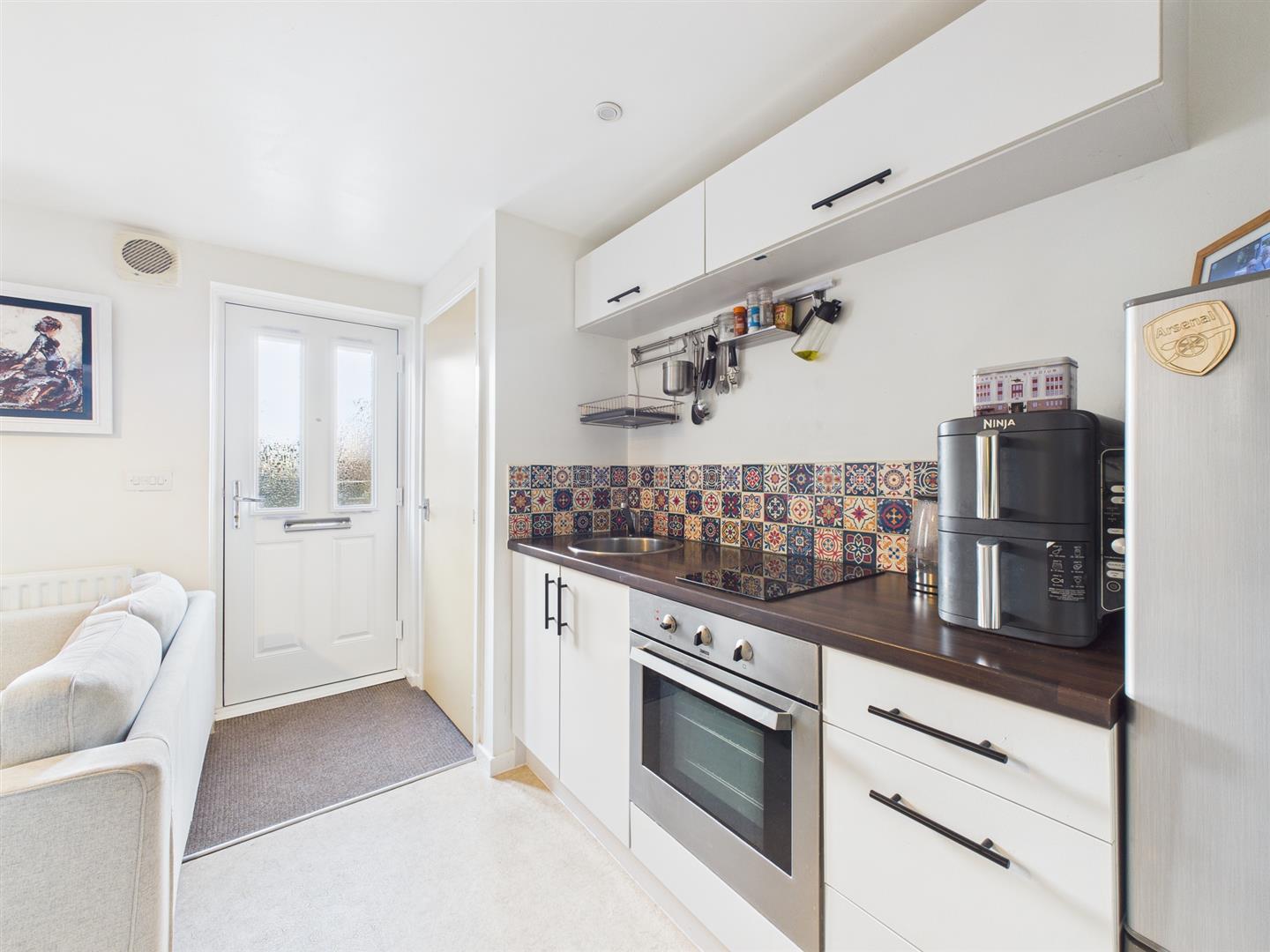 Kitchen - Comprising woodblock effect preparation surfaces, inset stainless steel sink unit, fitted base cupboards and drawers, complementary wall mounted cupboards, electric hob, built-in oven, appliance space suitable for fridge freezer, useful storage cupboard and doorway to double bedroom.