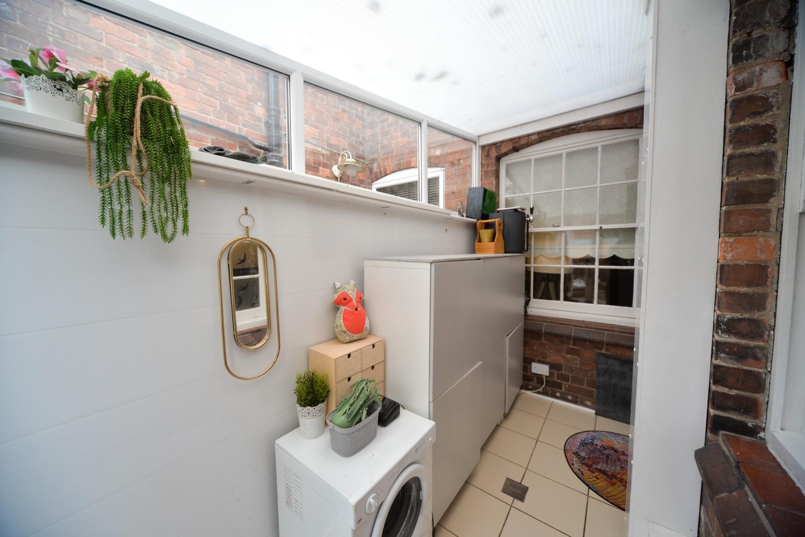1.95m x 5.81m (6'4" x 19'0") - Incorporates a range of solid wood hand painted base cupboards, drawers and matching wall mounted cabinets over, solid wood work preparation surfaces with matching upstands are inset with a one and a half sink with mixer tap over and a Neff induction hob with integrated oven beneath, there is an integrated dishwasher, fridge freezer, a door leads into the conservatory and there are two windows that look out to the side aspect, there is ample space for dining table and chairs.