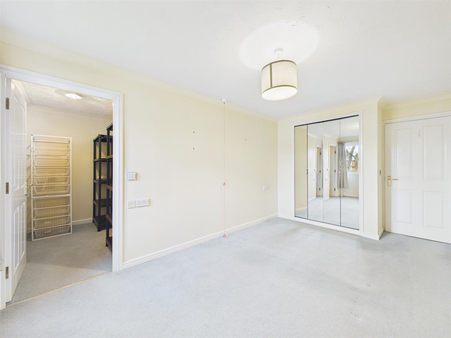 Bedroom One - 4.33 x 2.77 (14'2" x 9'1") - With electric heater, fitted wardrobe with mirrored doors, fitted coving, emergency pull cord, double glazed window to front and door to spacious walk-in storage room.