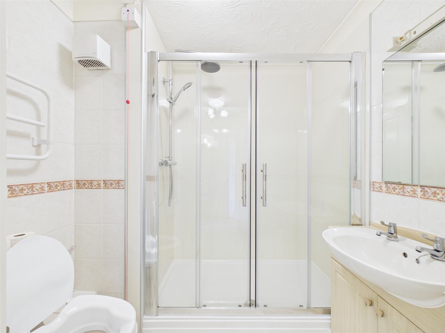 Shower Room - 2.08 x 1.69 (6'9" x 5'6") - Fully tiled with a white suite comprising low flush WC, vanity unit with wash handbasin and cupboards beneath, good sized shower cubicle, towel radiator and emergency pull cord.