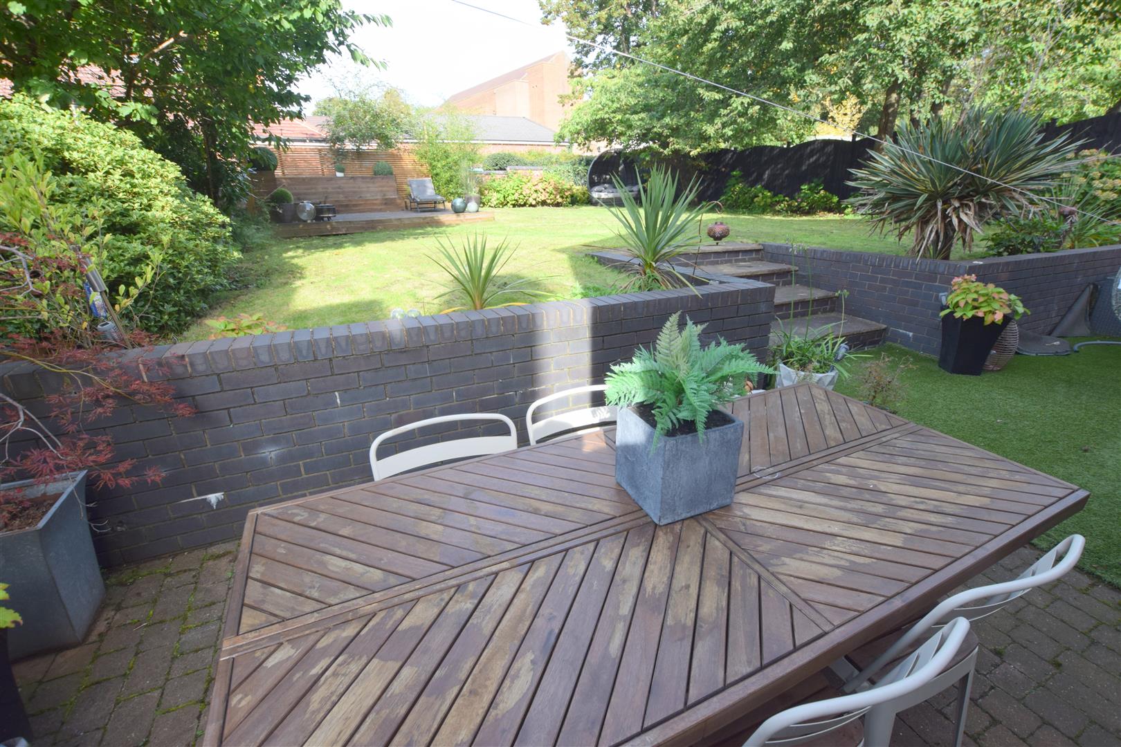 Rear Of Property - There is a split level garden with artificial lawn and block paving to the lower terrace with steps leading up to a raised lawn and herbaceous boarders containing shrubs and trees. There is a fabulous decked seating/dining area to the foot of the garden and the offer of outdoor dining and entertaining.