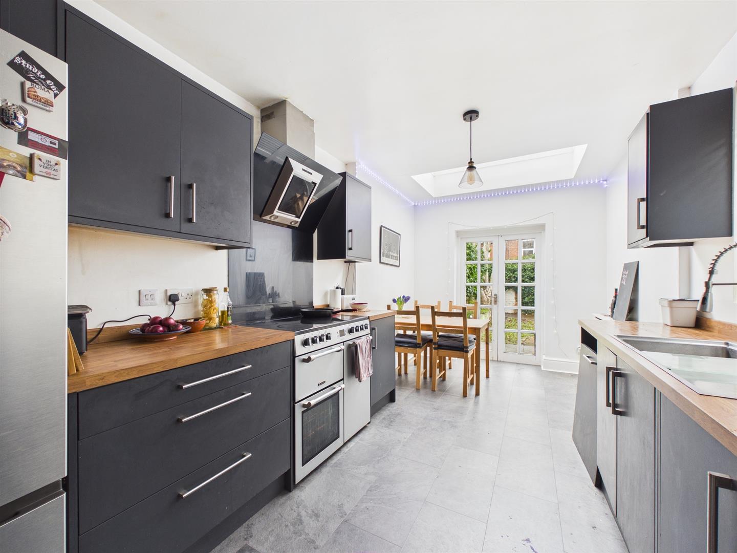 - Fitted Breakfast Kitchen With lantern Light Ceiling And French Doors