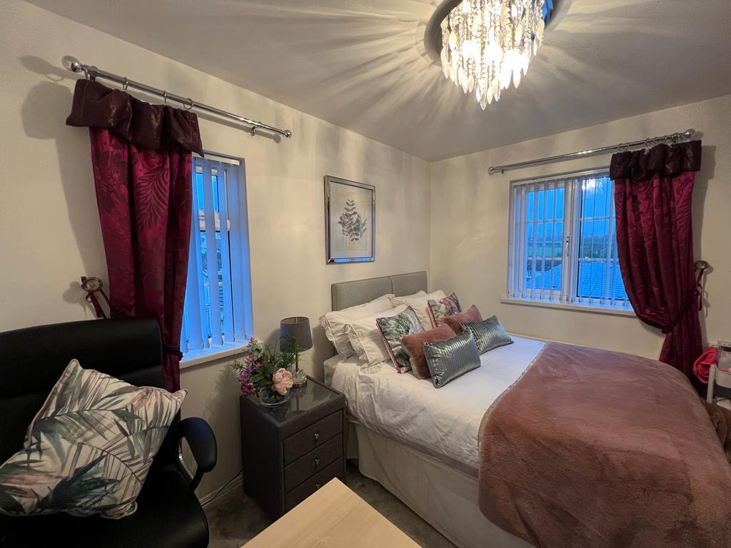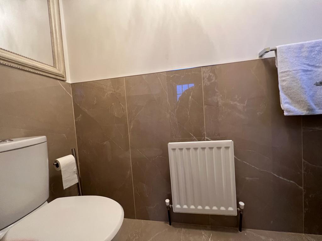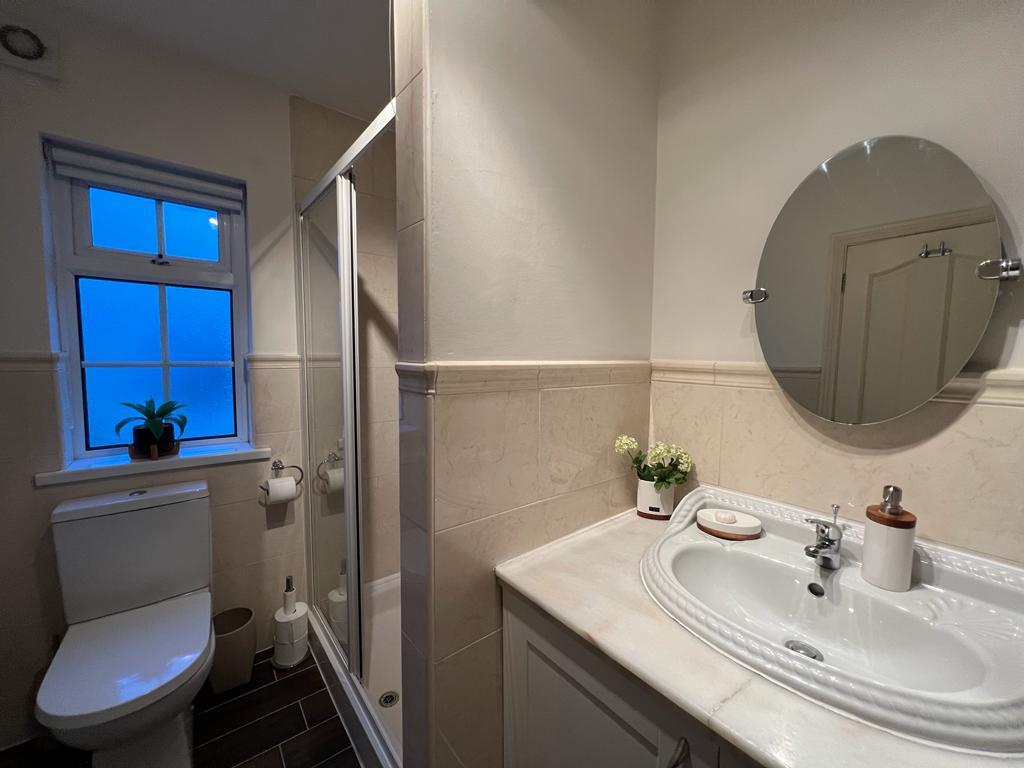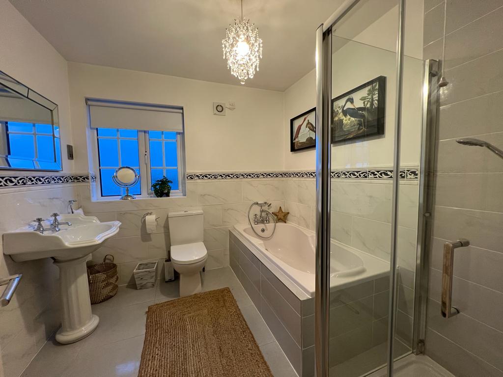 Comprising fully tiled walk electric shower; bath with telephone hand shower to taps; wash hand basin and WC; half tiled walls; tiled floor