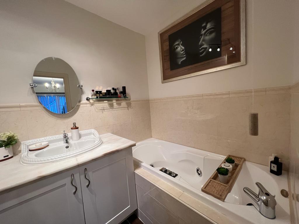 Comprising jacuzzi style bath; wash hand basin set in vanity unit and WC; fully tiled walk in shower; 1/2 tiled walls; tiled floor