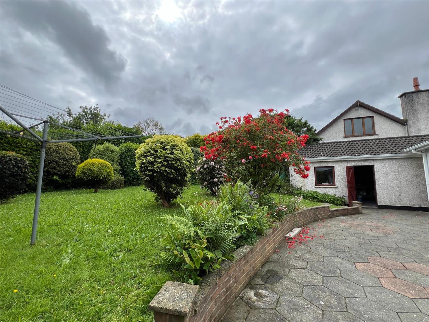 Neat lawns stocked with abundance of mature plants, trees and shrubs.