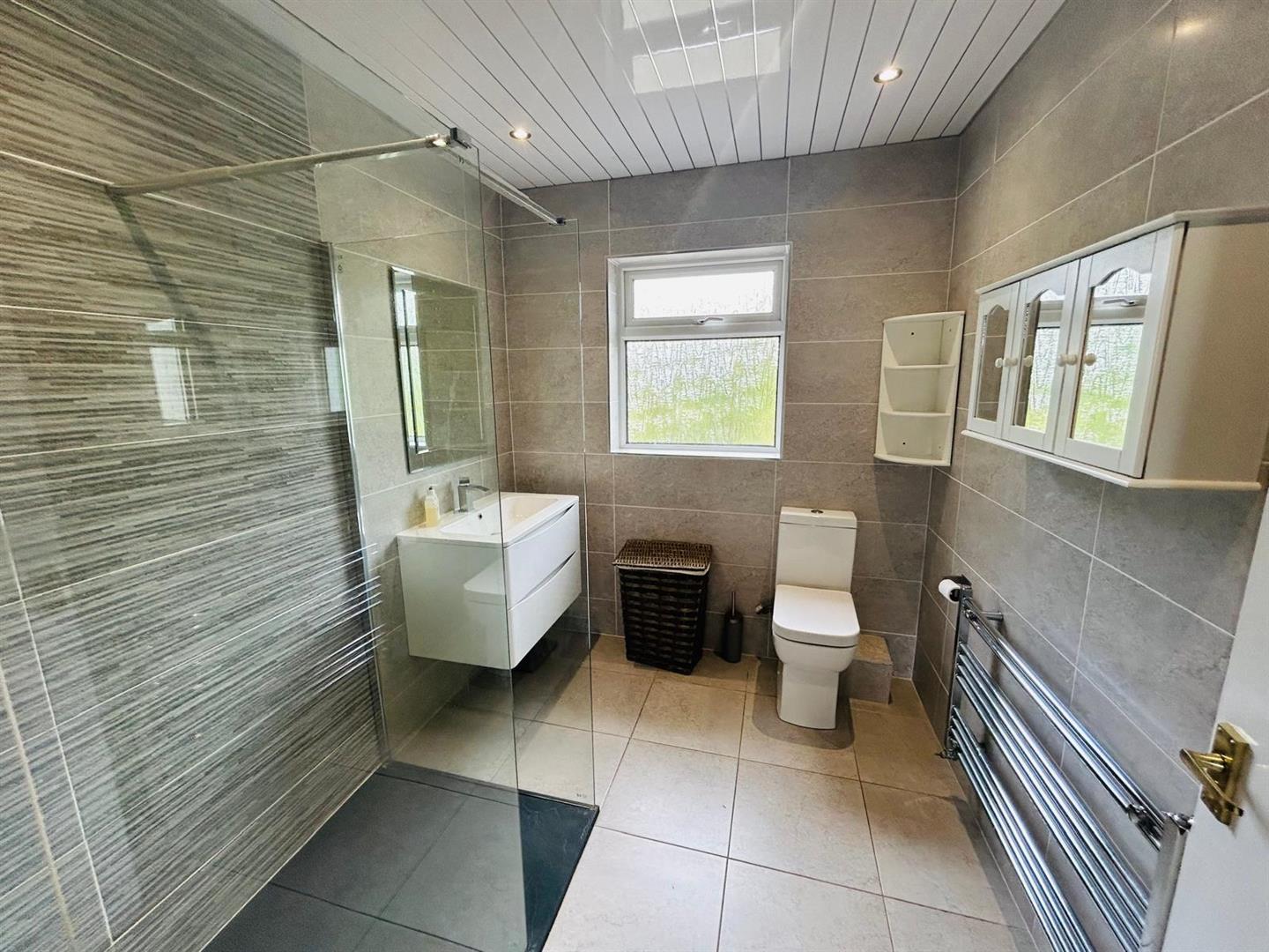 Comprising shower, whb set in vanity unit, wc, chrome radiator, recessed lighting, fully tiled walls and floor.