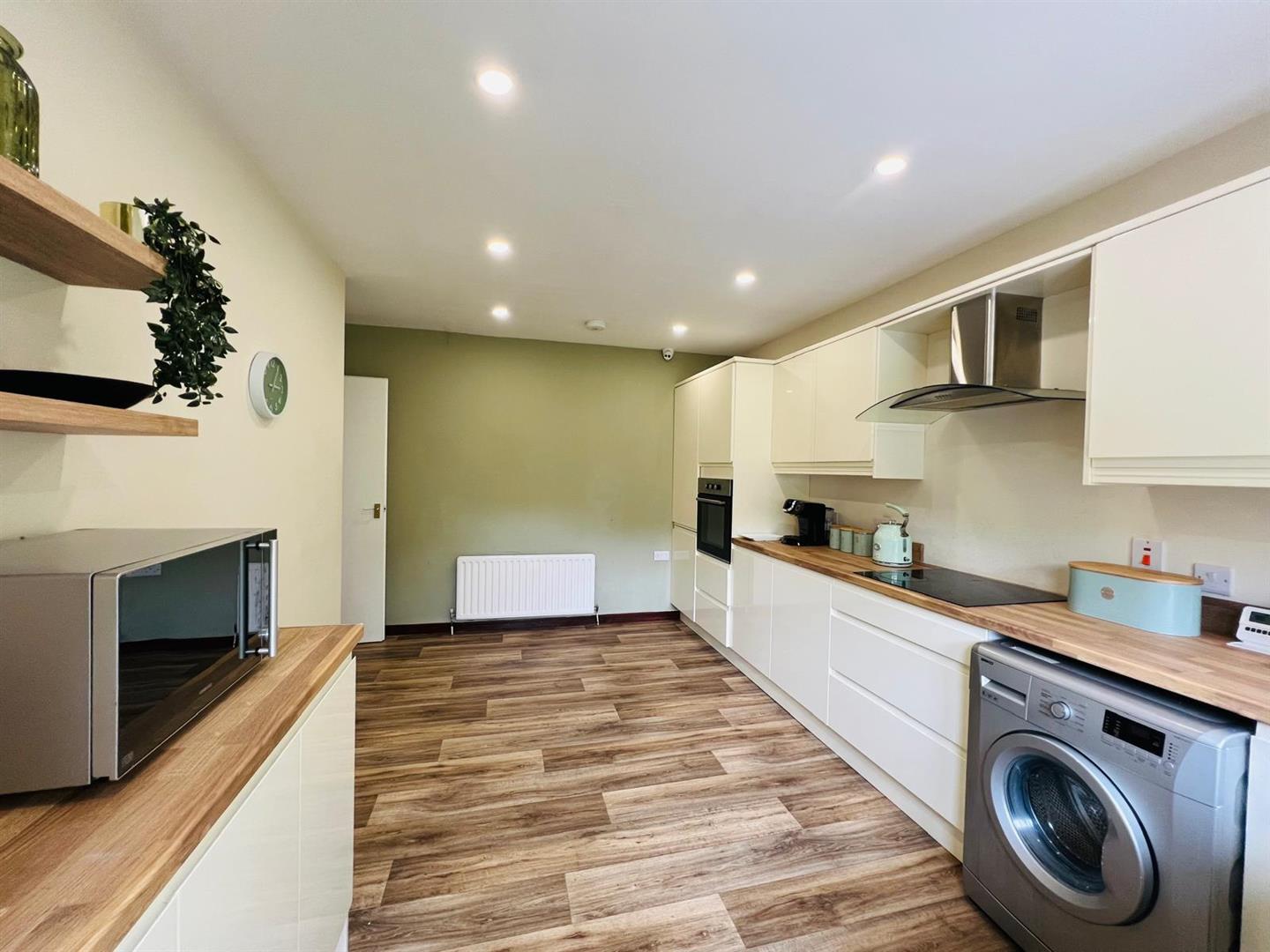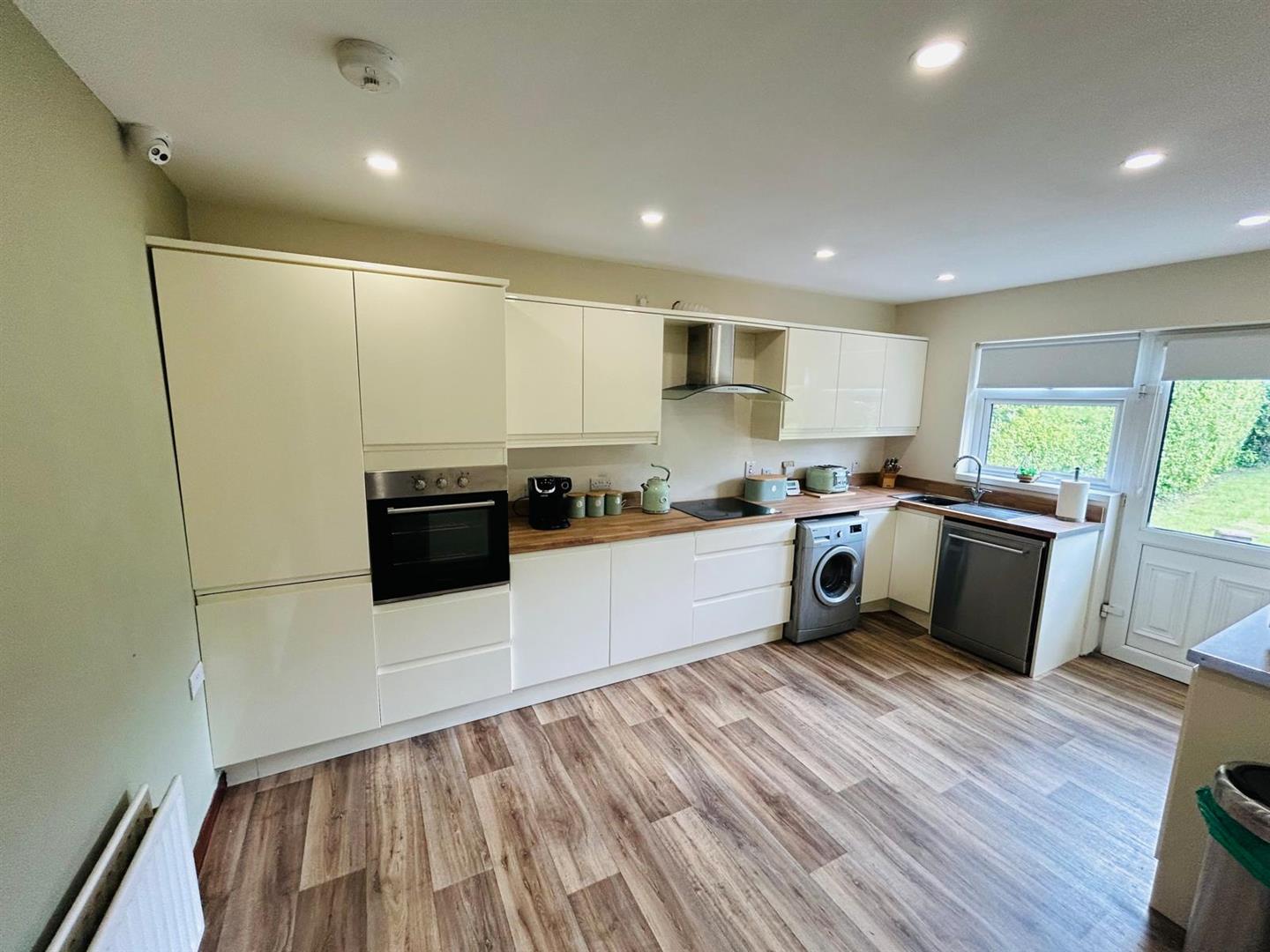 4.85m x 3.63m (15'11" x 11'11") - Having range of eye and low level units, single drainer stainless steel sink unit with mixer taps, hob, oven, stainless steel extractor hood, integrated fridge/freezer, plumbed for washing machine and dishwasher, recessed lighting.