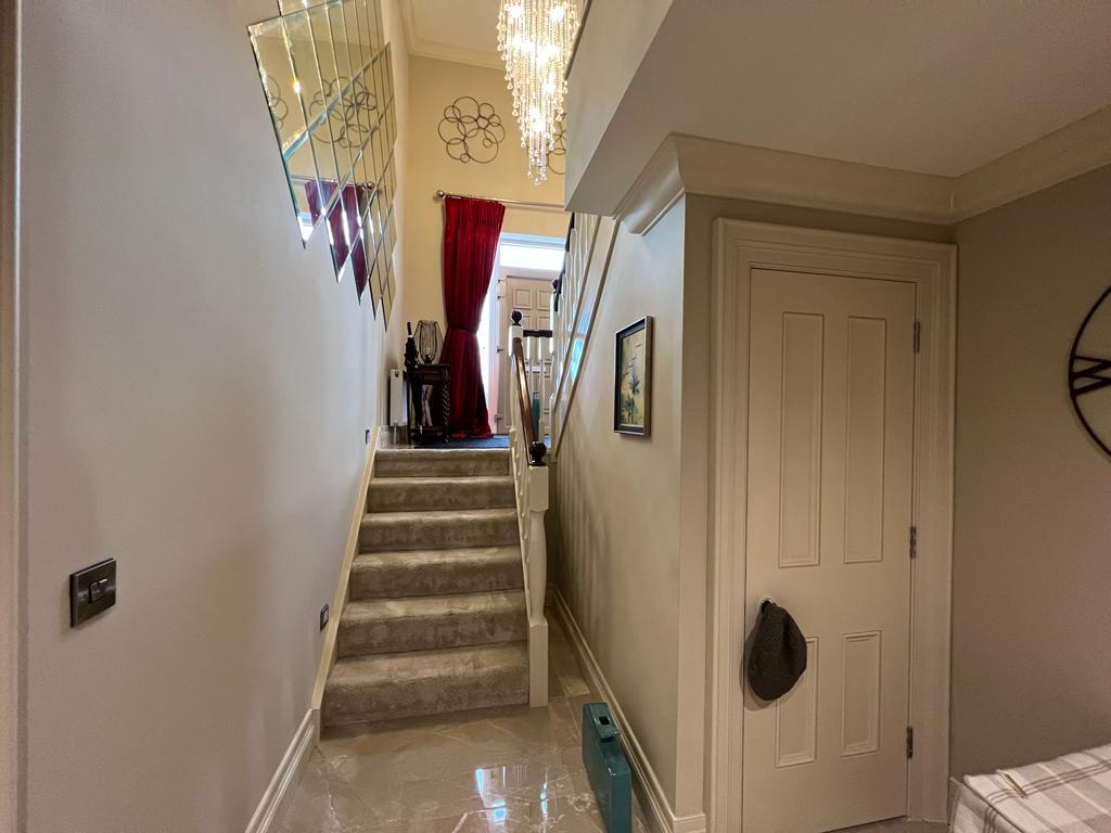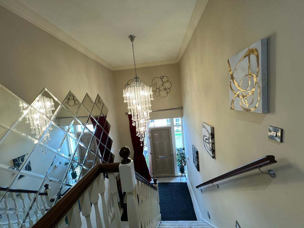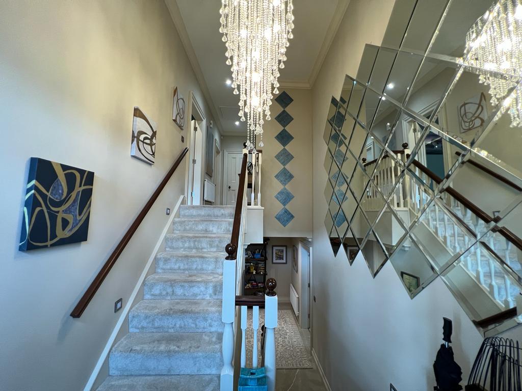 Having feature wall mirror, staircase lighting, ceiling cornicing, recessed lighting, porcelain tiled floor. Carpeted staircase leading to first floor hall having 'Herringbone' hardwood flooring.