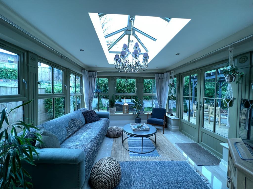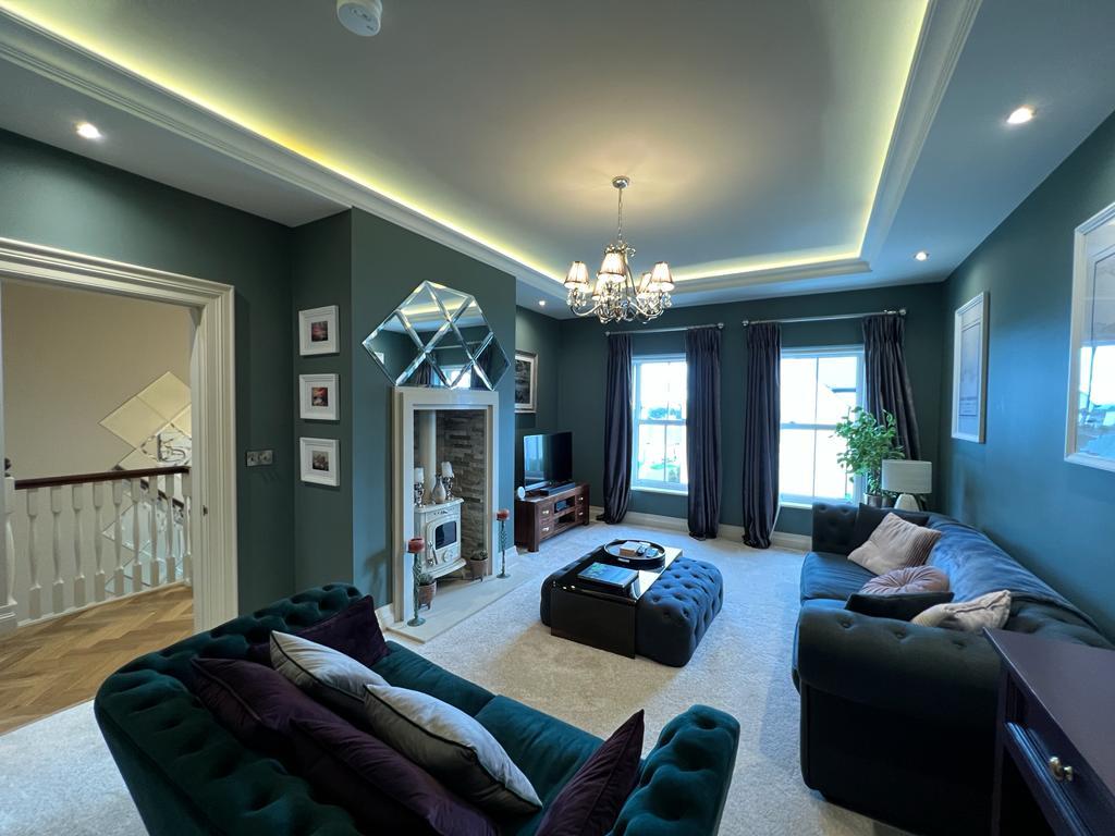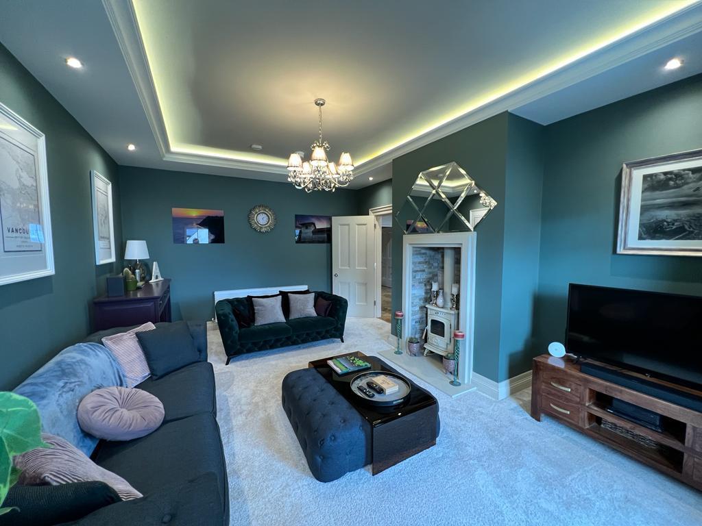 5.49m x 3.84m wp (18' x 12'7" wp) - Having multi fuel stove set in brick surround, drop ceiling with concealed lighting.