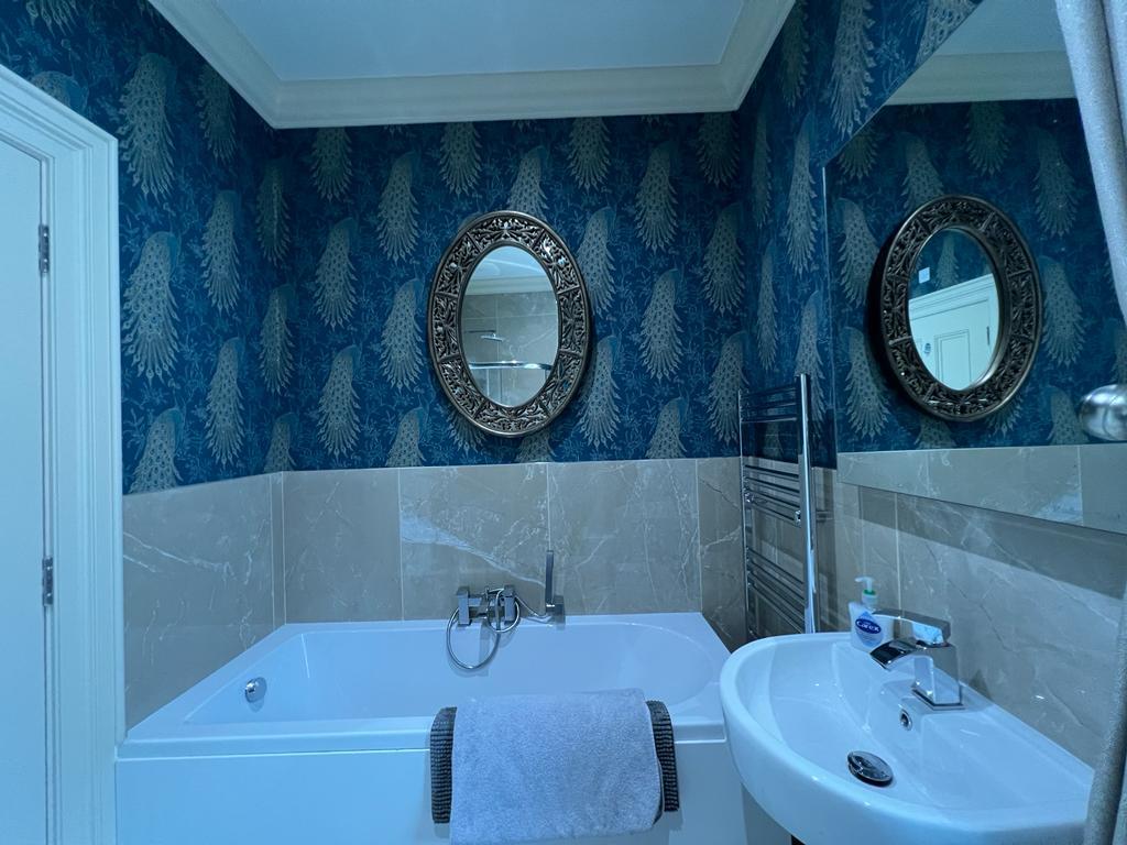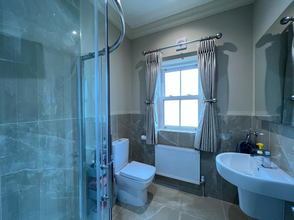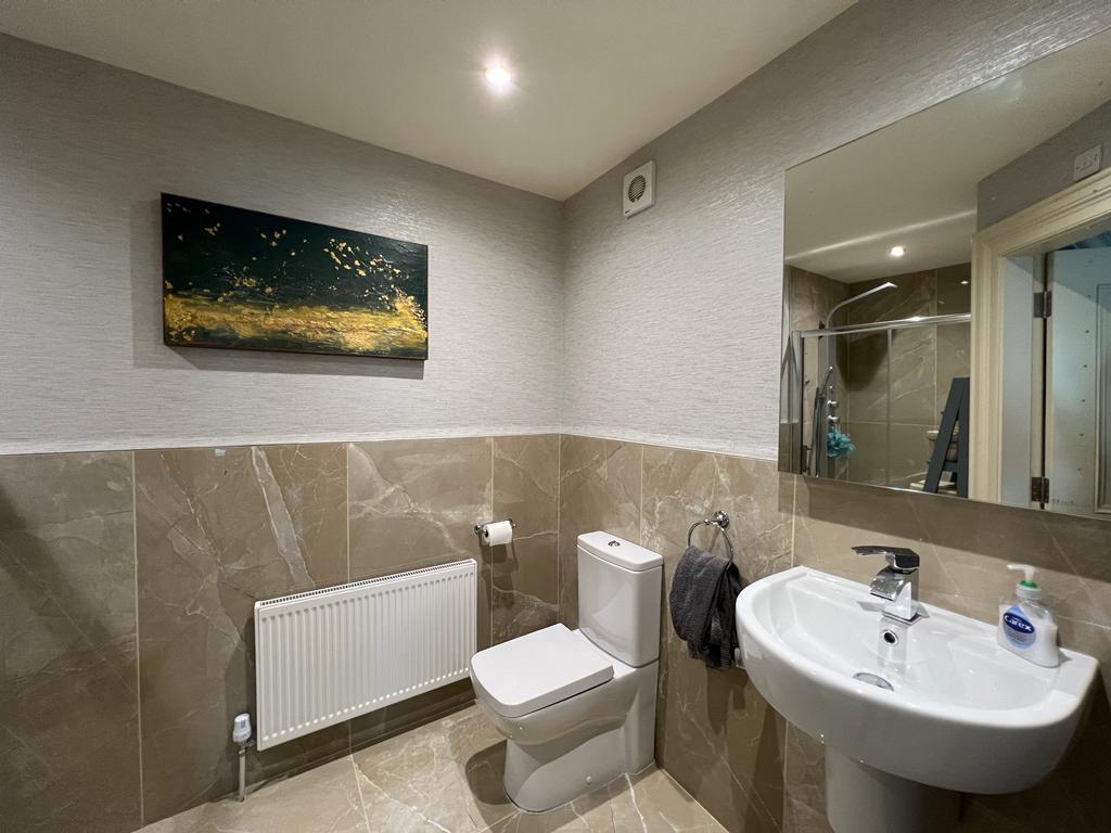 Comprising multi feature walk in shower, whb and wc, mirror with Bluetooth, ceiling cornicing, 1/2 tiled walls, tiled floor.