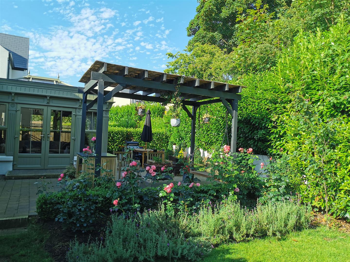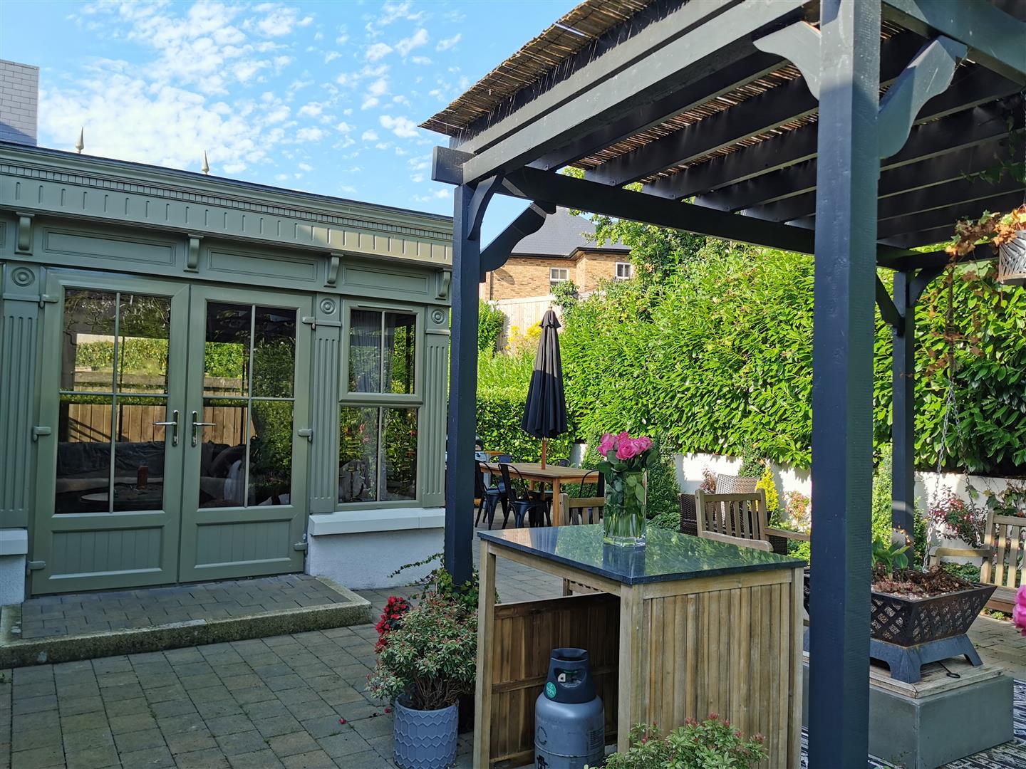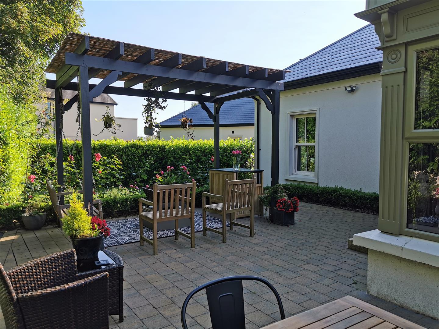 Paved patio area with pergola.