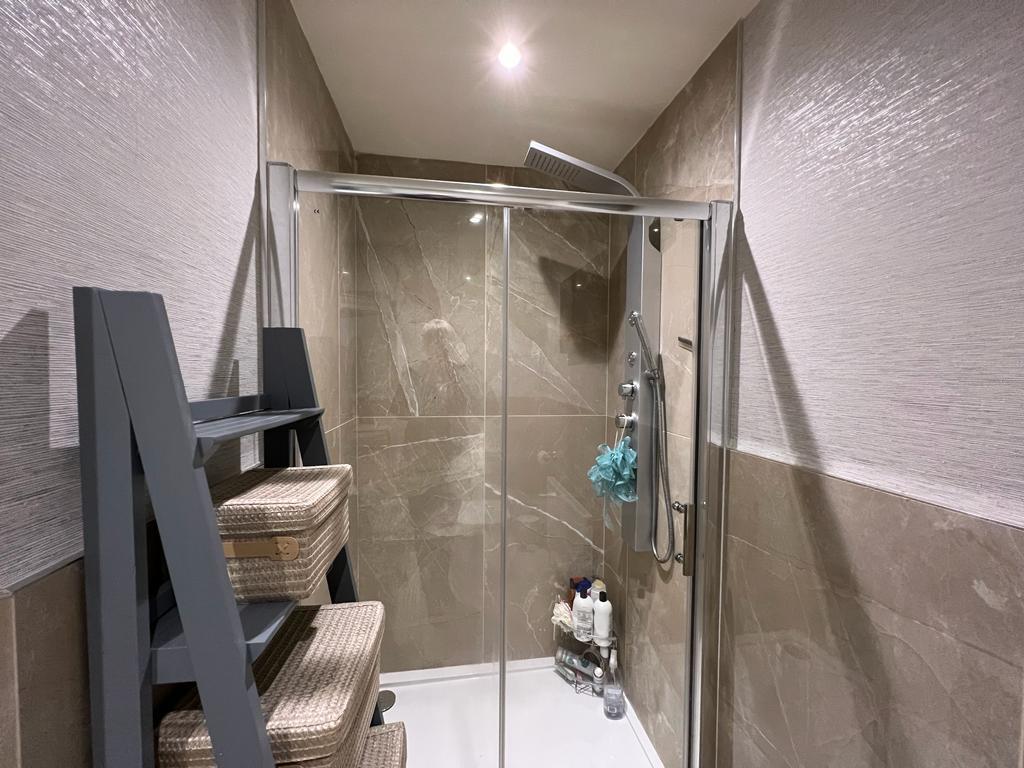 Comprising fully tiled multi feature shower, WHB and WC, 1/2 tiled walls, tiled floor, recessed lighting.