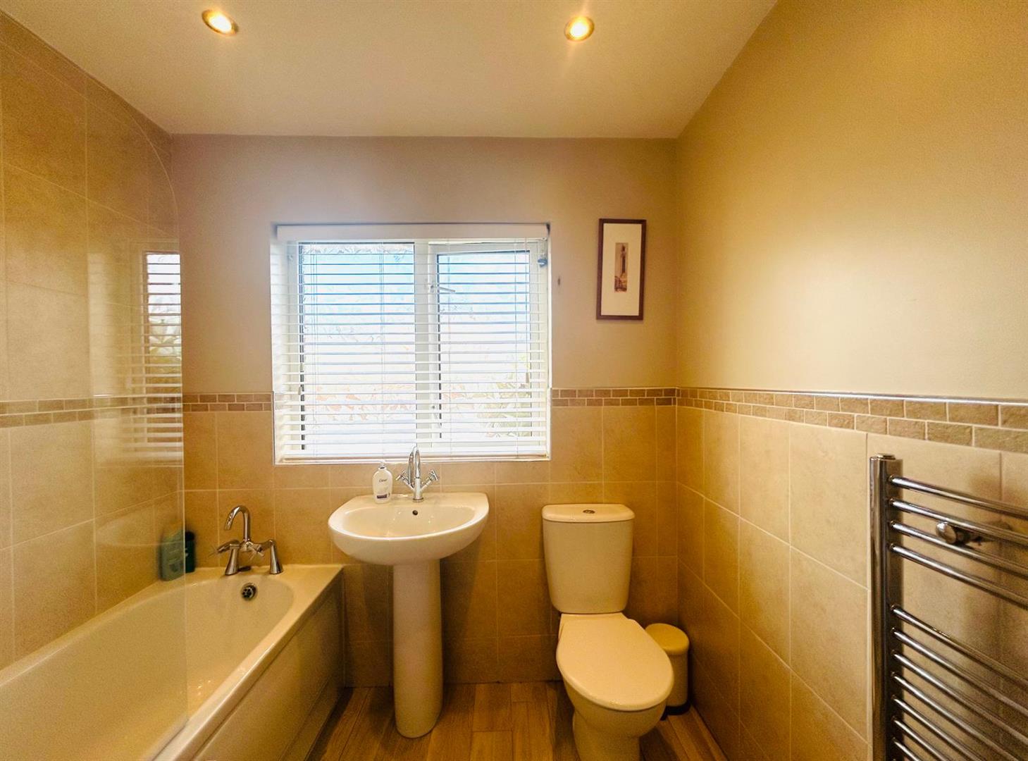 Comprising bath with tiling around and electric shower over, shower screen, whb and wc, recessed lighting, 1/2 tiled walls, tiled floor.