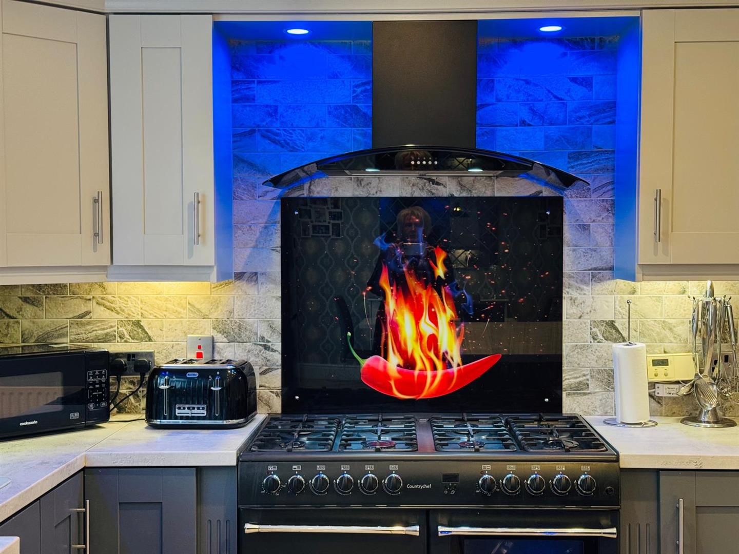 7.19m x 3.58m (23'7" x 11'9") - Having range of eye and low level units with lighting under, 1 1/2 bowl stainless steel sink unit with mixer taps, plumbed for dishwasher, space for fridge / freezer, Belling cooking centre with gas hob and electric underovens, extractor hood, centre island with breakfast bar and storage, ceiling cornicing, recessed lighting, ample dining space with French doors leading to rear.
