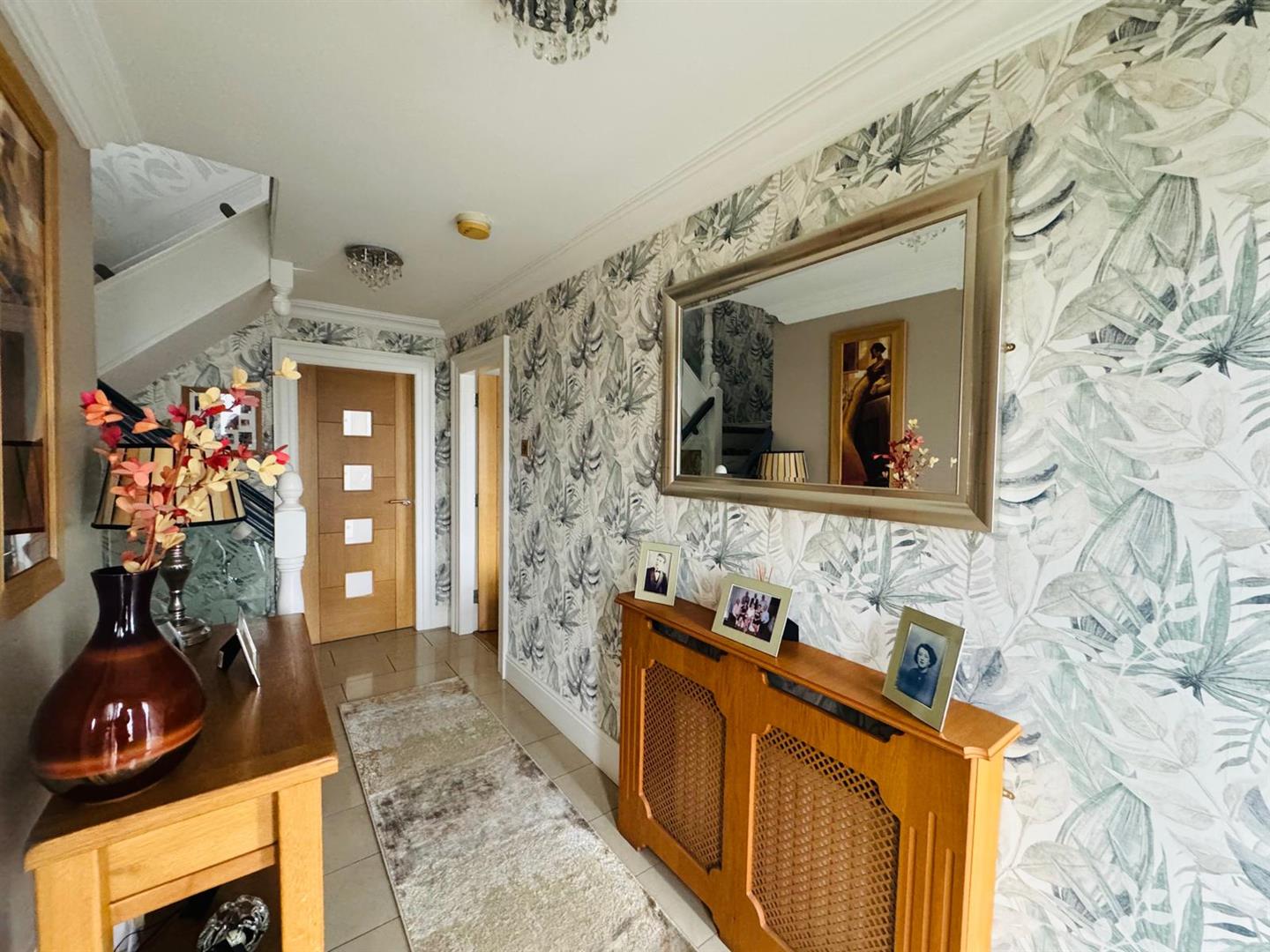 Having understairs storage, ceiling cornicing and tiled floor.
