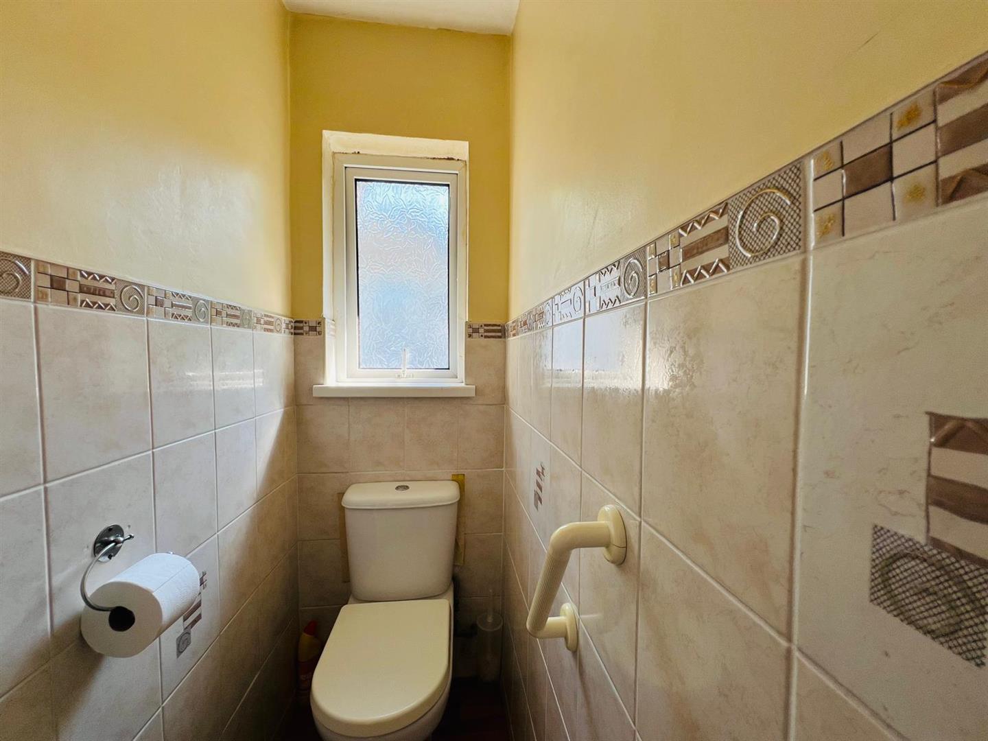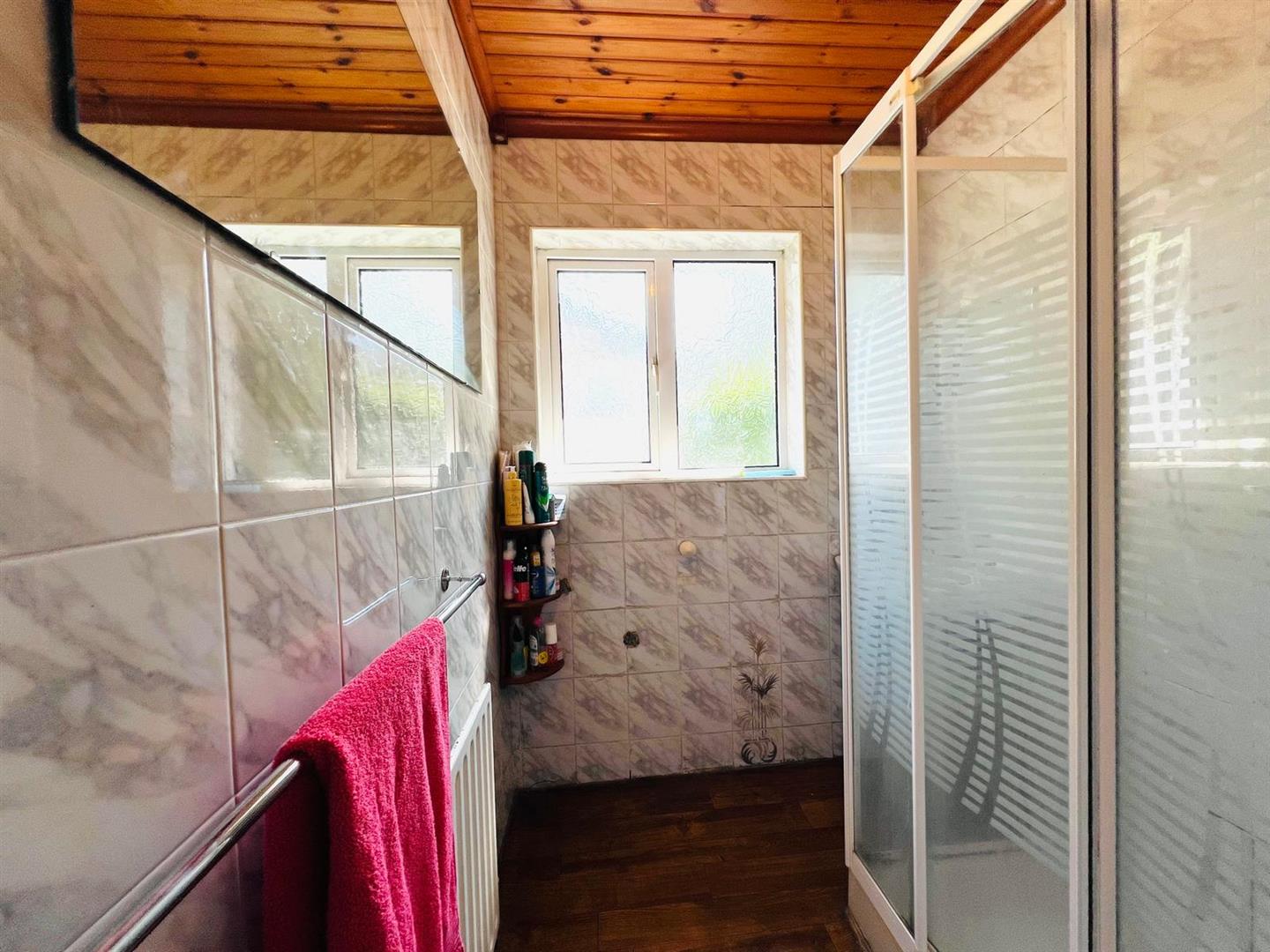 Comprising walk in electric shower, whb, hotpress, fully tiled walls.