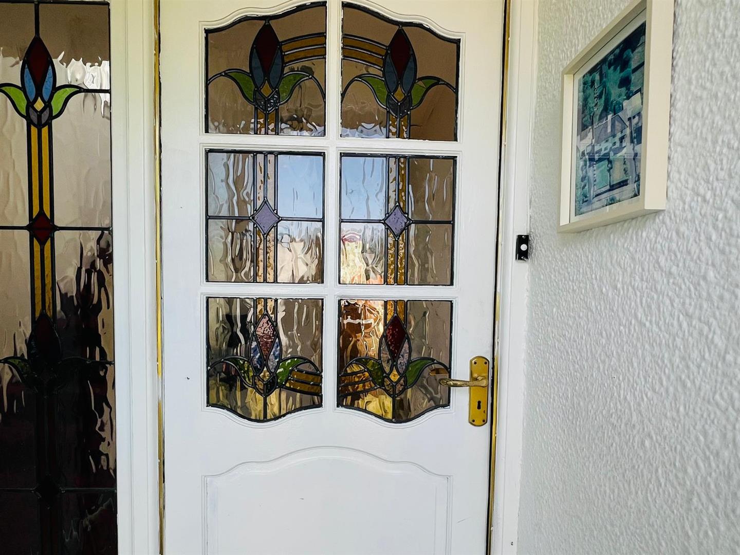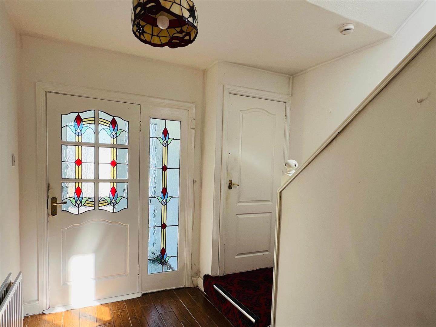 Having tiled floor, stained glass door leading to hallway.
