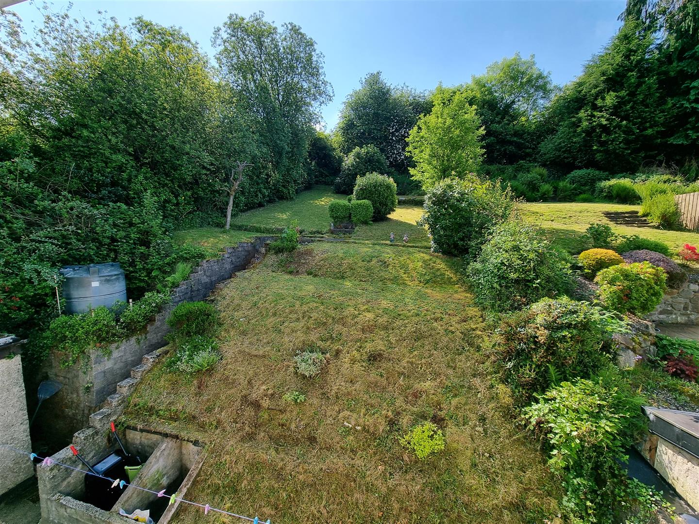 Raised lawn to rear with abundance of plants, trees and shrubs.