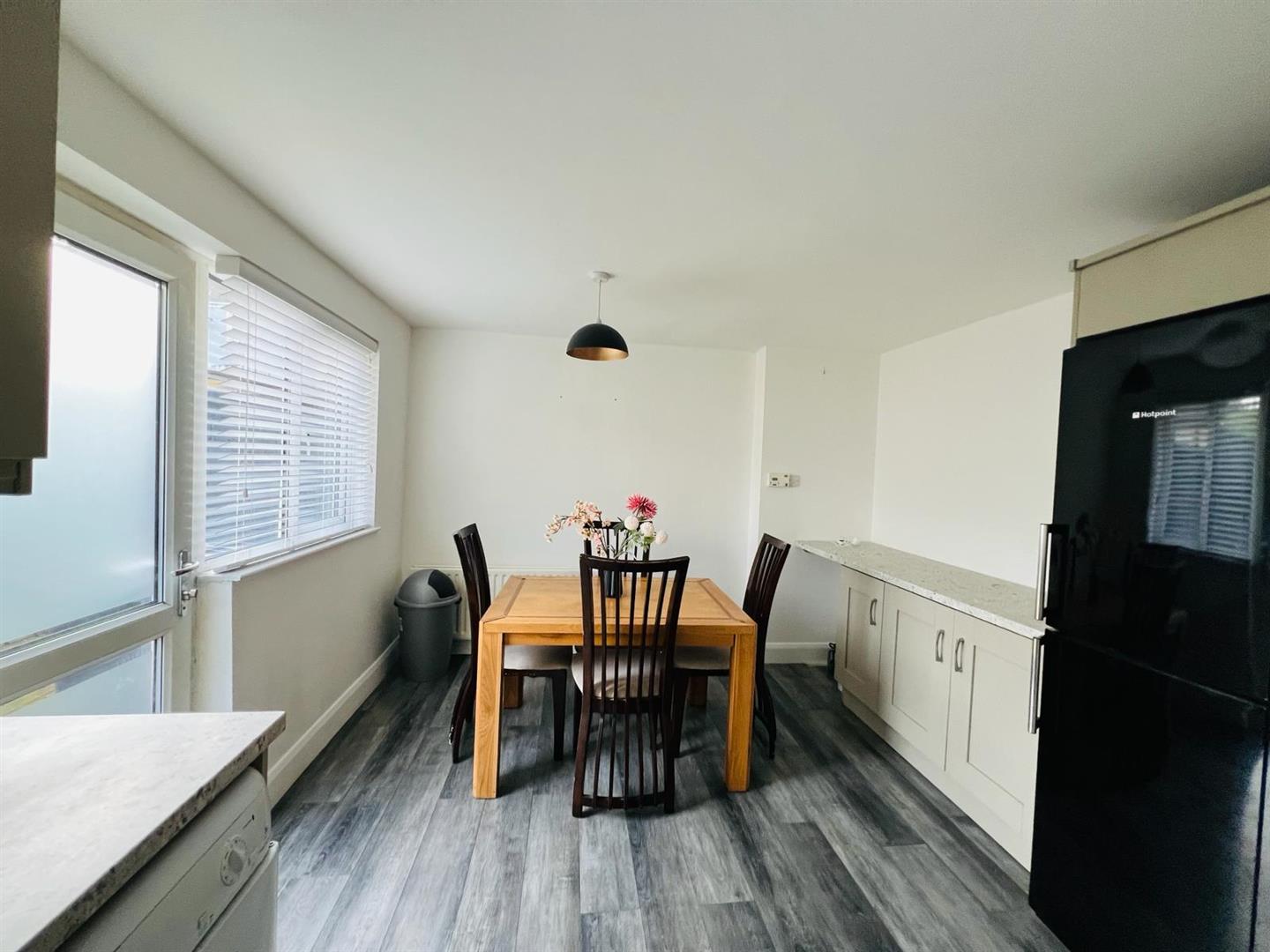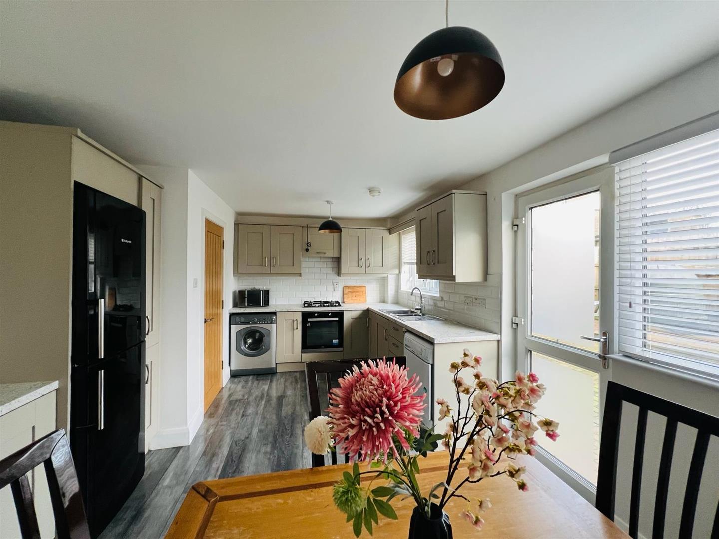 5.38m x 3.43m (17'8" x 11'3") - Having range of eye and low level units, tiling between units, 1 1/2 bowl stainless steel sink unit with mixer taps, gas hob, electric underoven, Hotpoint washing machine and tumble dryer, Hotpoint fridge / freezer, ample dining space, laminated wooden floor.