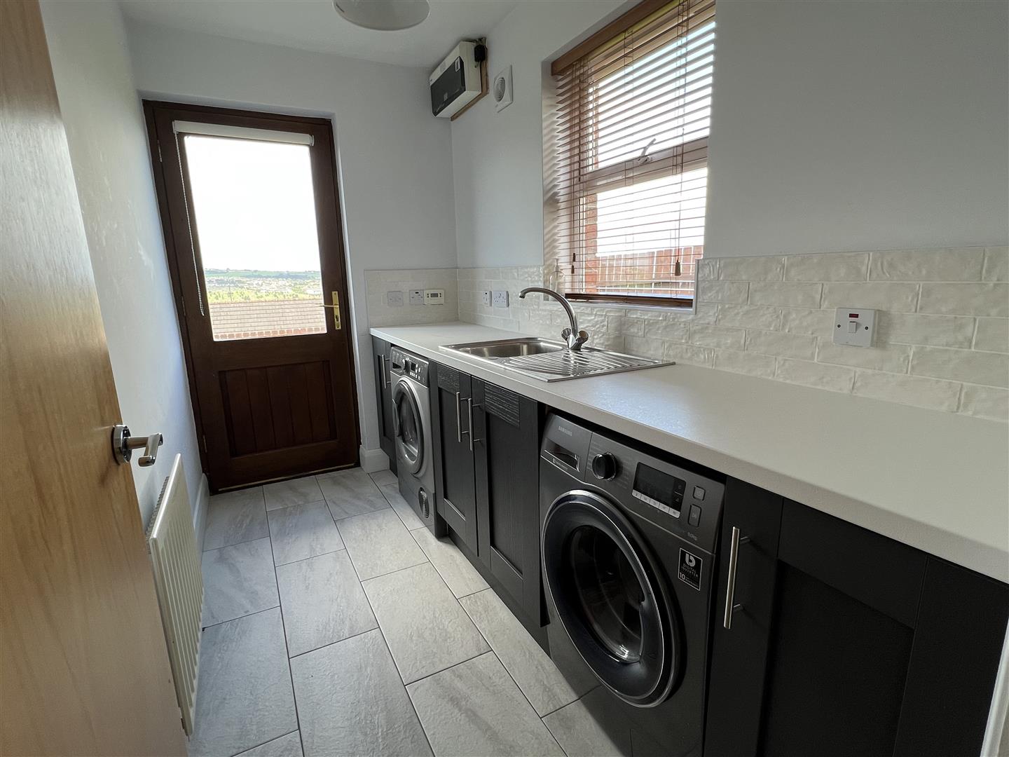Having sink unit, plumbed for washing machine, space for tumble dryer, tiled floor.